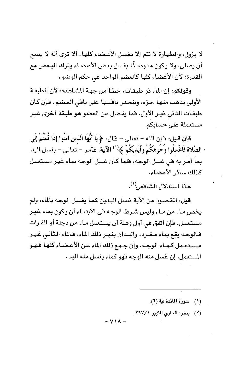 وقولكم: إن الماء ذو طبقات، خطأ من جهة المشاهدة؛ لأن الطبقة الأولى يذهب منها جزء، وينحدر باقيها على باقي العضو. فإن كان طبقات الثاني غير الأول، فما يفضل عن العضو هو طبقة أخرى غير مستعملة على حسابكم.
