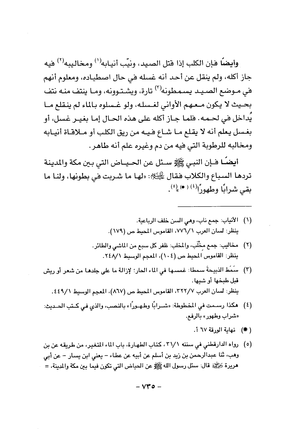 أيضا فإن النبي صَلَّى اللَّهُ عَلَيْهِ وَسَلَّمَ سئل عن الحياض التي بين مكة والمدينة تردها السباع والكلاب فقال عليه السلام: (لها ما شربت في بطونها ولنا ما بقي شرابا وطهورا).