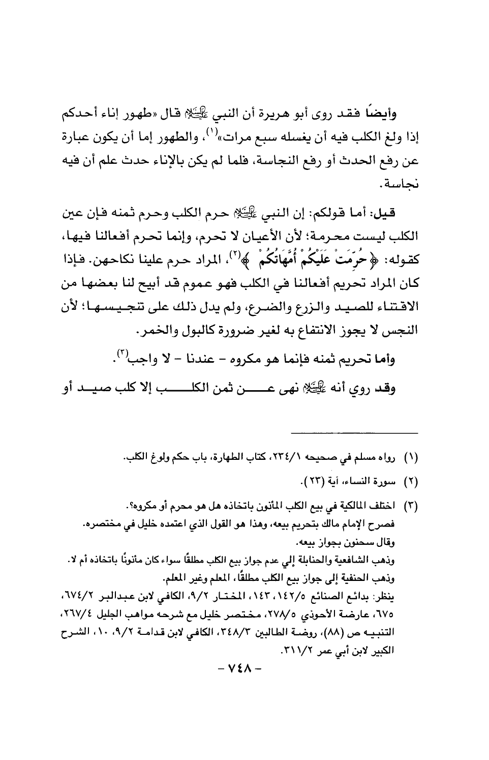 قيل: أما قولكم: إن النبي عليه السلام حرم الكلب وحرم ثمنه فإن عين الكلب ليست محرمة؛ لأن الأعيان لا تحرم، وإنما تحرم أفعالنا فيها، كقوله: {حرمت عليكم أموالكم}، المراد حرم علينا نكاحهن. فإذا كان المراد تحريم أفعالنا في الكلب فهو عموم قد أبيح لنا بعضها من الاقتناء للصيد والزرع والضرع، ولم يدل ذلك على تنجيسها؛ لأن النجس لا يجوز الانتفاع به لغير ضرورة كالبول والخمر.