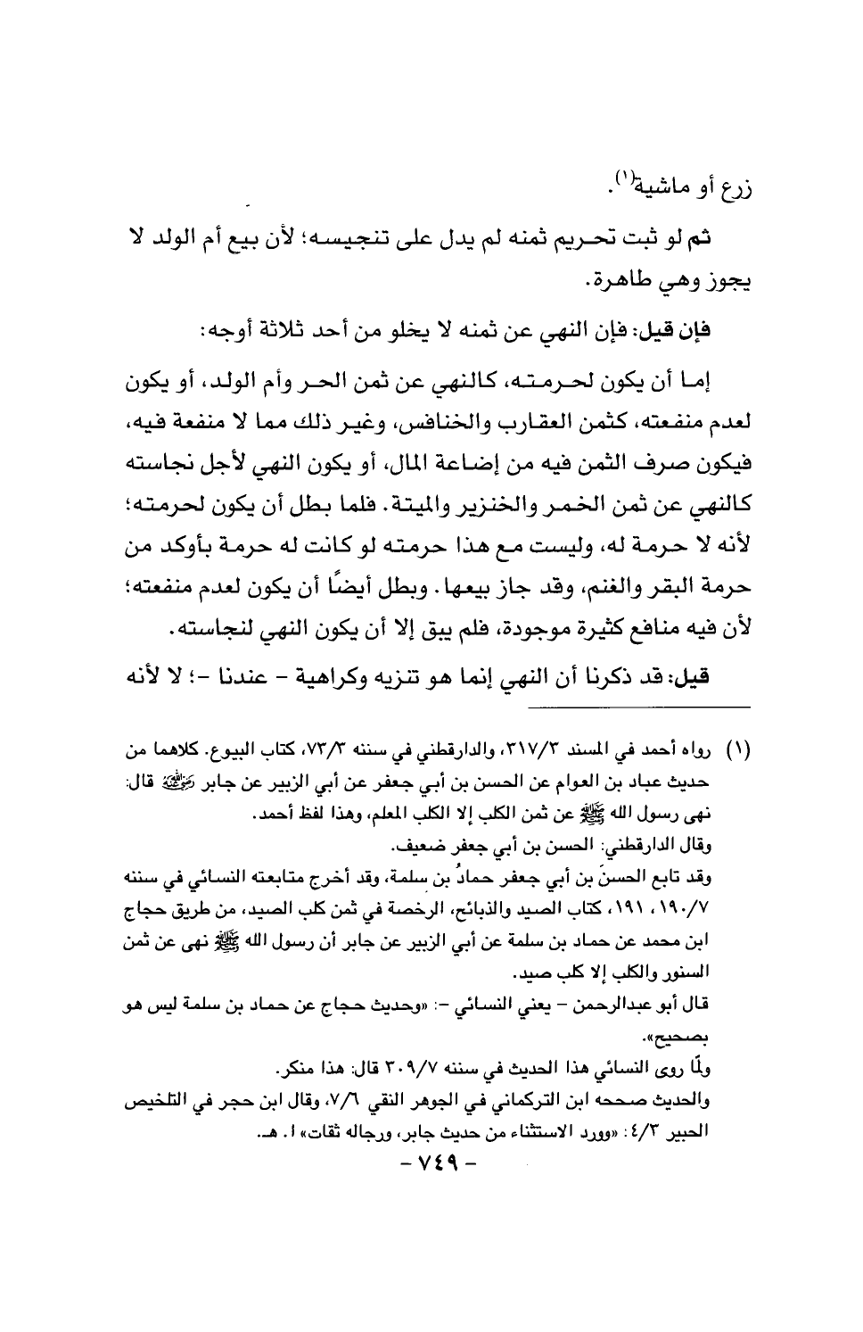 إما أن يكون لحرمته، كالنهي عن ثمن الحر وأم الولد، أو يكون لعدم منفعته، كثمن العقارب والخنافس، وغير ذلك مما لا منفعة فيه، فيكون صرف الثمن فيه من إضاعة المال، أو يكون النهي لأجل نجاسته كالنهي عن ثمن الخمر والخنزير والميتة. فلما بطل أن يكون لحرمته؛ لأنه لا حرمة له، وليست مع هذا حرمته لو كانت له حرمة بأوكد من حرمة البقر والغنم، وقد جاز بيعها. وبطل أيضا أن يكون لعدم منفعته لان فيه منافع كثيرة موجودة، فلم يبق إلا أن يكون النهي لنجاسته.