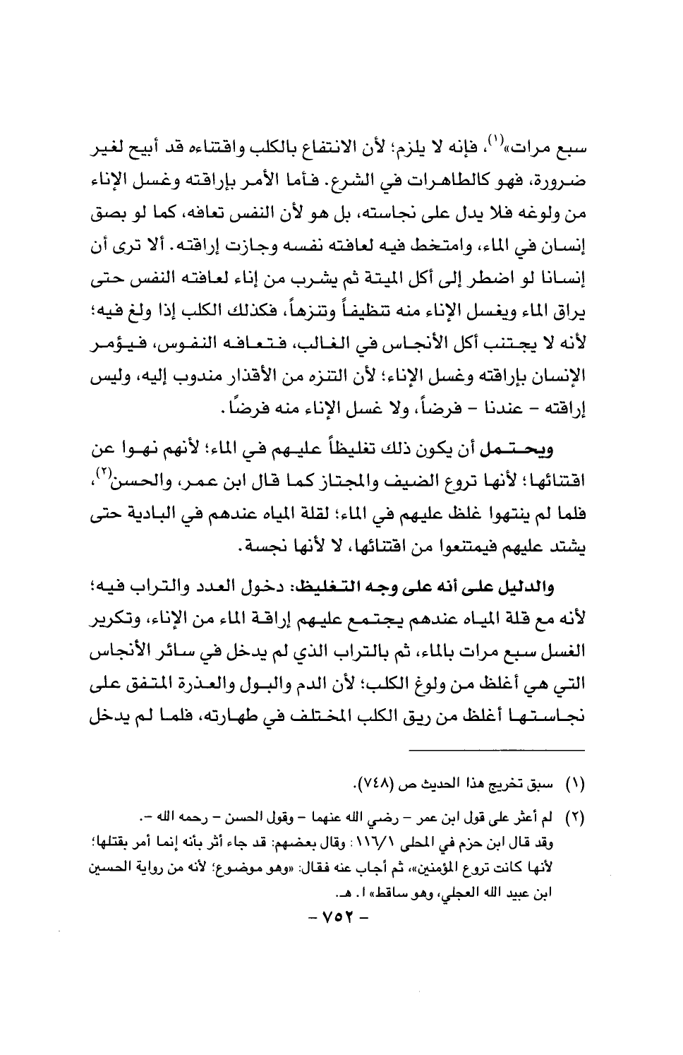 سبع مرات)، فإنه لا يلزم؛ لأن الانتفاع بالكلب واقتناؤه قد أبيح لغير ضرورة، فهو كالطاهرات في الشرع. فأما الأمر بإراقته وغسل الإناء من ولوغه فلا يدل على نجاسته، بل هو لأن النفس تعافه، كما لو بصق إنسان في الماء، وامتخط فيه لعافته نفسه وجازت إراقته. ألا ترى أن إنسانا لو اضطر إلى أكل الميتة ثم يشرب من إناء لعافته النفس حتى يراق الماء ويغسل الإناء منه تنظيفا وتنزها، فكذلك الكلب إذا ولغ فيه؛ لأنه لا يجتنب أكل الأنجاس في الغالب، فتعافه النفوس، فيؤمر الإنسان بإراقته وغسل الإناء؛ لأن التنزه من الأقذار مندوب إليه، وليس إراقته - عندنا - فرضا، ولا غسل الإناء منه فرضا.