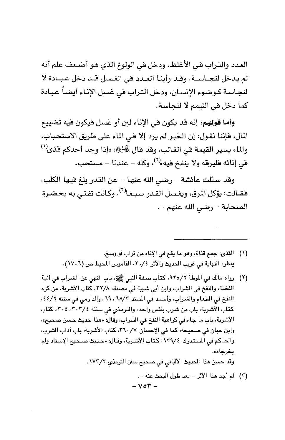 وأما قولهم: إنه قد يكون في الإناء لبن أو غسل فيكون فيه تضييع المال، فإننا نقول: إن الخبر لم يرد إلا في الماء على طريق الاستحباب، والماء يسير القيمة في الغالب، وقد قال عليه السلام: (إذا وجد أحدكم قذى في إنائه فليرقه ولا ينفخ فيه)، وكله - عندنا - مستحب.