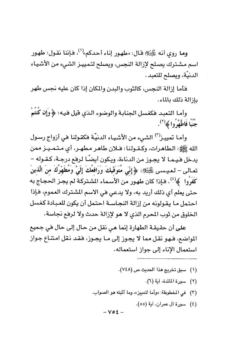 وأما تمييز الشيء من الأشياء الدنية فكقولنا في أزواج رسول الله صَلَّى اللَّهُ عَلَيْهِ وَسَلَّمَ: الطاهرات، وكقولنا: فلان طاهر ويكون طاهر مطهر، أي متميز ممن يدخل فيما لا يجوز من الدناءة، ويكون أيضا لرفع درجة كقوله - تعالى - لعيسى عليه السلام: {إني متوفيك ورافعك إلي ومطهرك من الذين كفروا}. فإذا كان طهور من الأسماء المشتركة لم يجز الحجاج به حتى يعلم أي ذلك أريد به، ولا يدعي في الاسم المشترك العموم، فإذا احتمل ما يقولونه من إزالة النجاسة احتمل أن يكون للعبادة كغسل الخلوق من ثوب المحرم الذي لا هو لإزالة حدث ولا لرفع نجاسة.