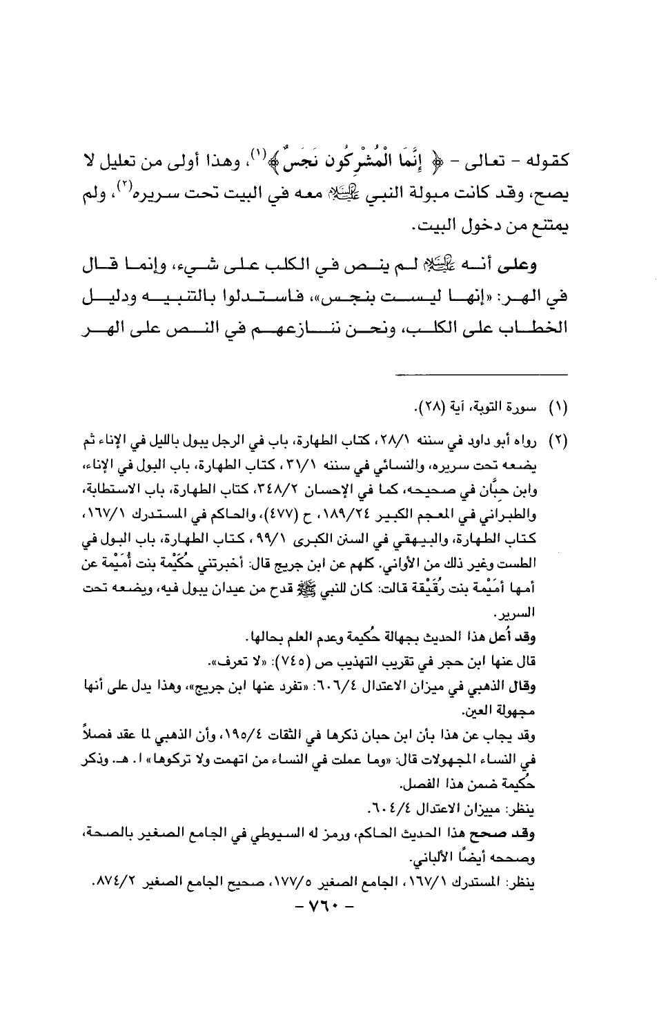 كقوله - تعالى - {إنما المشركون نجس}، وهذا أولى من تعليل لا يصح، وقد كانت مبولة النبي عليه السلام معه في البيت تحت سريره، ولم يمتنع من دخول البيت.