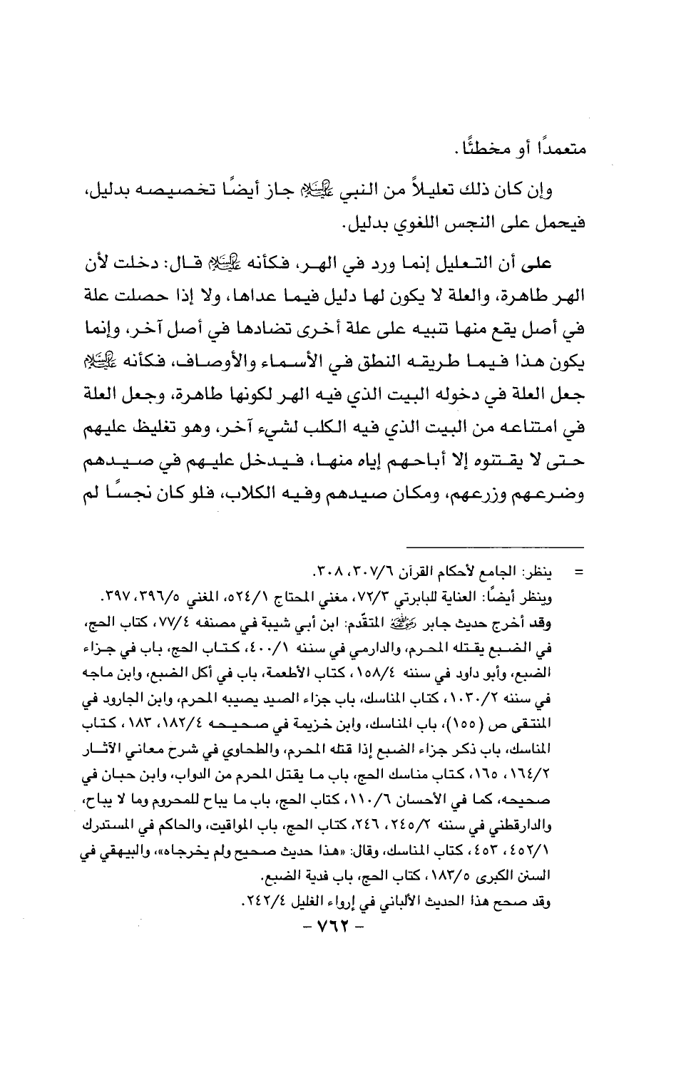 على أن التعليل إنما ورد في الهر، فكأنه عليه السلام قال: دخلت لأن الهر طاهرة، والعلة لا يكون لها دليل فيما عداها، ولا إذا حصلت علة في أصل يقع منها تنبيه على علة أخرى تضادها في أصل آخر، وإنما يكون هذا فيما طريقه النطق في الأسماء والأوصاف، فكأنه عليه السلام جعل العلة في دخوله البيت الذي في الكلب لشيء آخر، وهو تغليظ عليهم حتى لا يقتنوه إلا أباحهم منها، فيدخل عليهم في صيدهم وضرعهم وزرعهم، ومكان صيدهم وفيه الكلاب، فلو كان نجسا لم