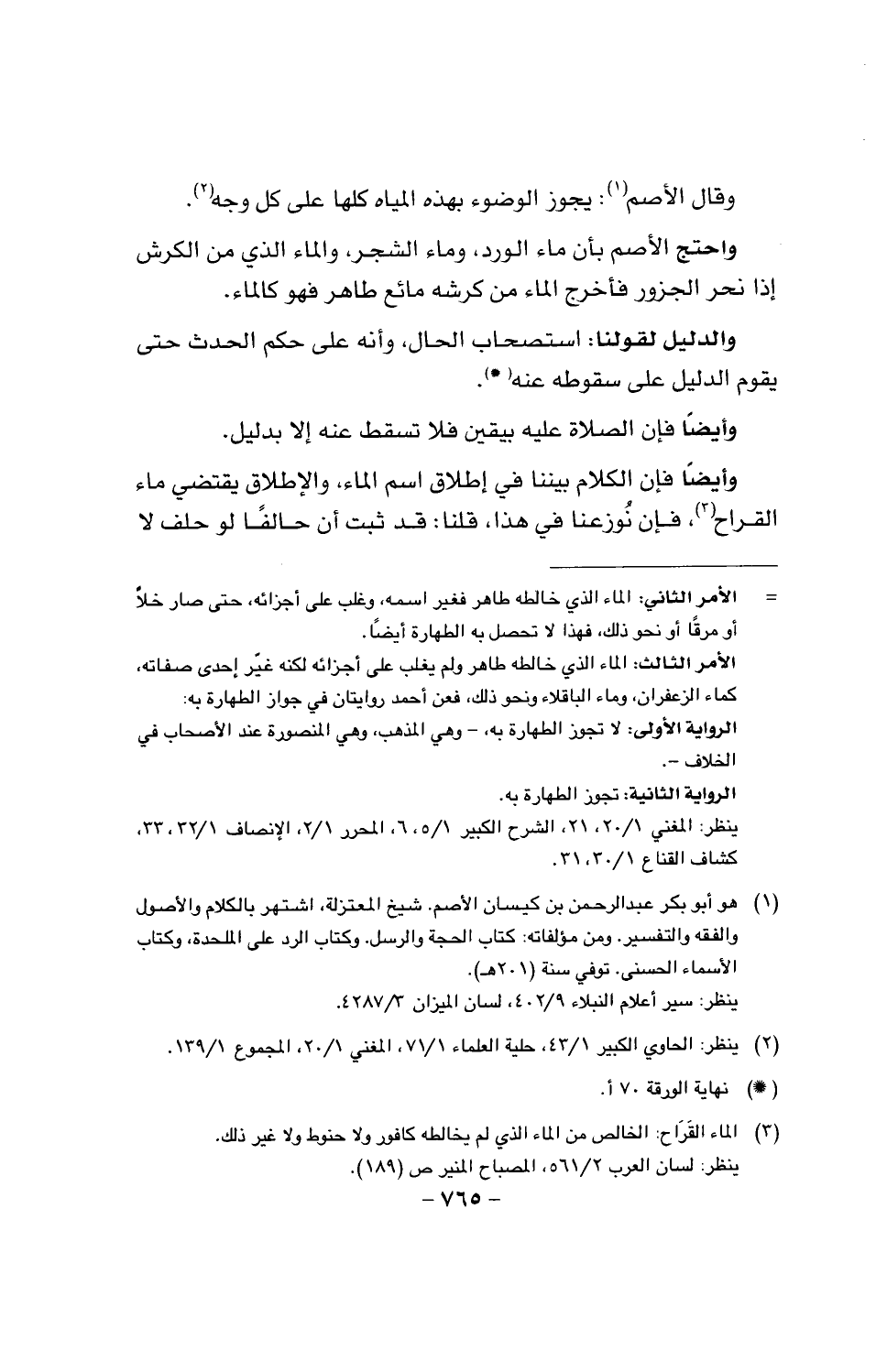 واحتج الأصم بان ماء الورد وماء الشجر، والماء الذي من الكرش إذا نحر الجزور فأخرج الماء من كرشه مائع طاهر فهو كالماء.
