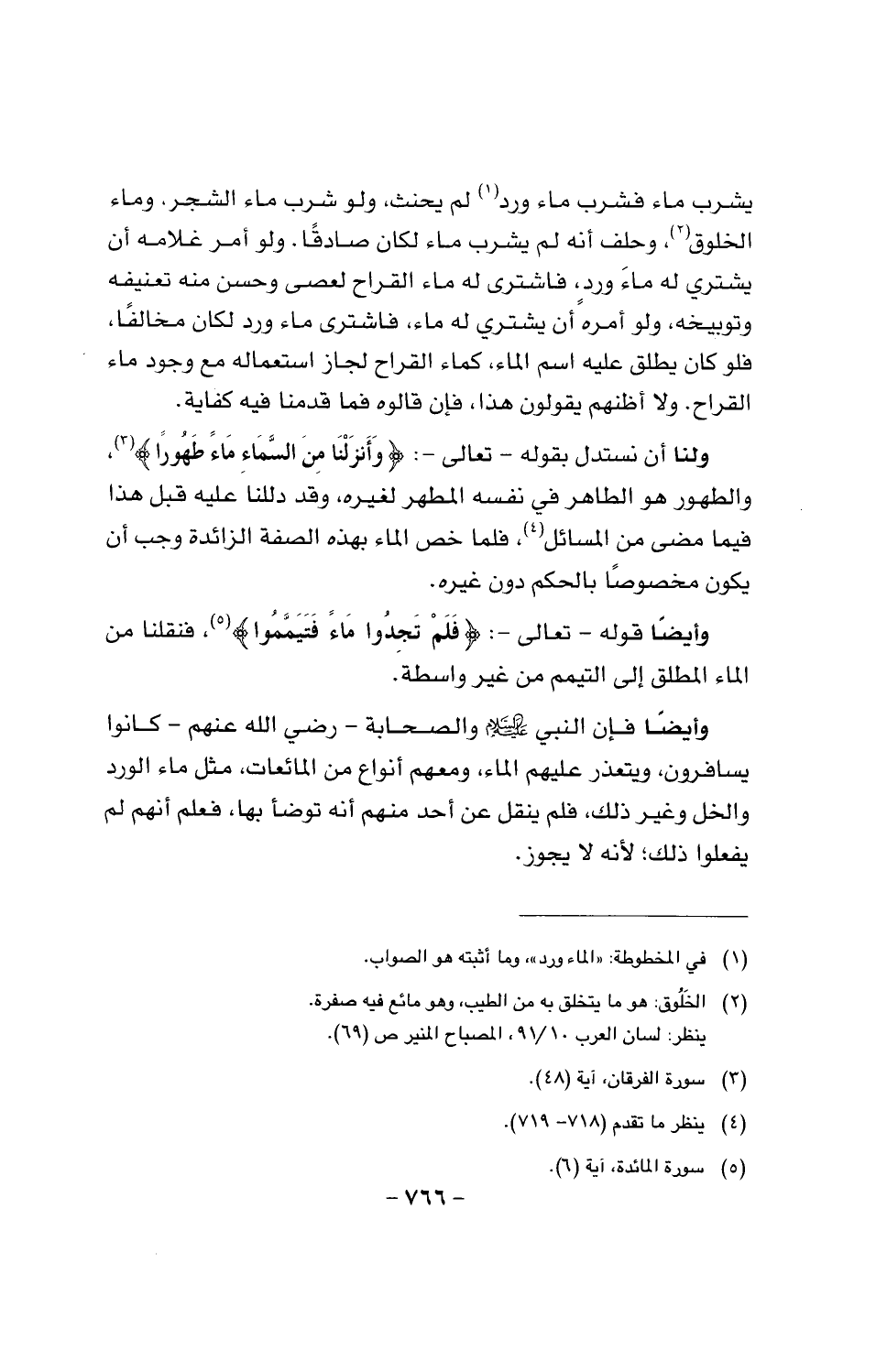 يشرب ماء فشرب ما ورد لم يحنث، ولو شرب ماء الشجر، وماء الخلوق، وحلف أنه لم يشرب ماء لكان صادقا. ولو أمر غلامه أن يشتري له ماء ورد، فاشترى له ماء القراح لعصى وحسن منه تعنيفه وتوبيخه، ولو أمره أن يشتري له ماء، فاشترى ما ورد لكان مخالفا، فلو كان يطلق عليه اسم الماء، كماء القراح لجاز استعماله مع وجود ماء القراح. ولا أظنهم يقولون هذا، فإن قالوه فما قدمنا فيه كفاية.