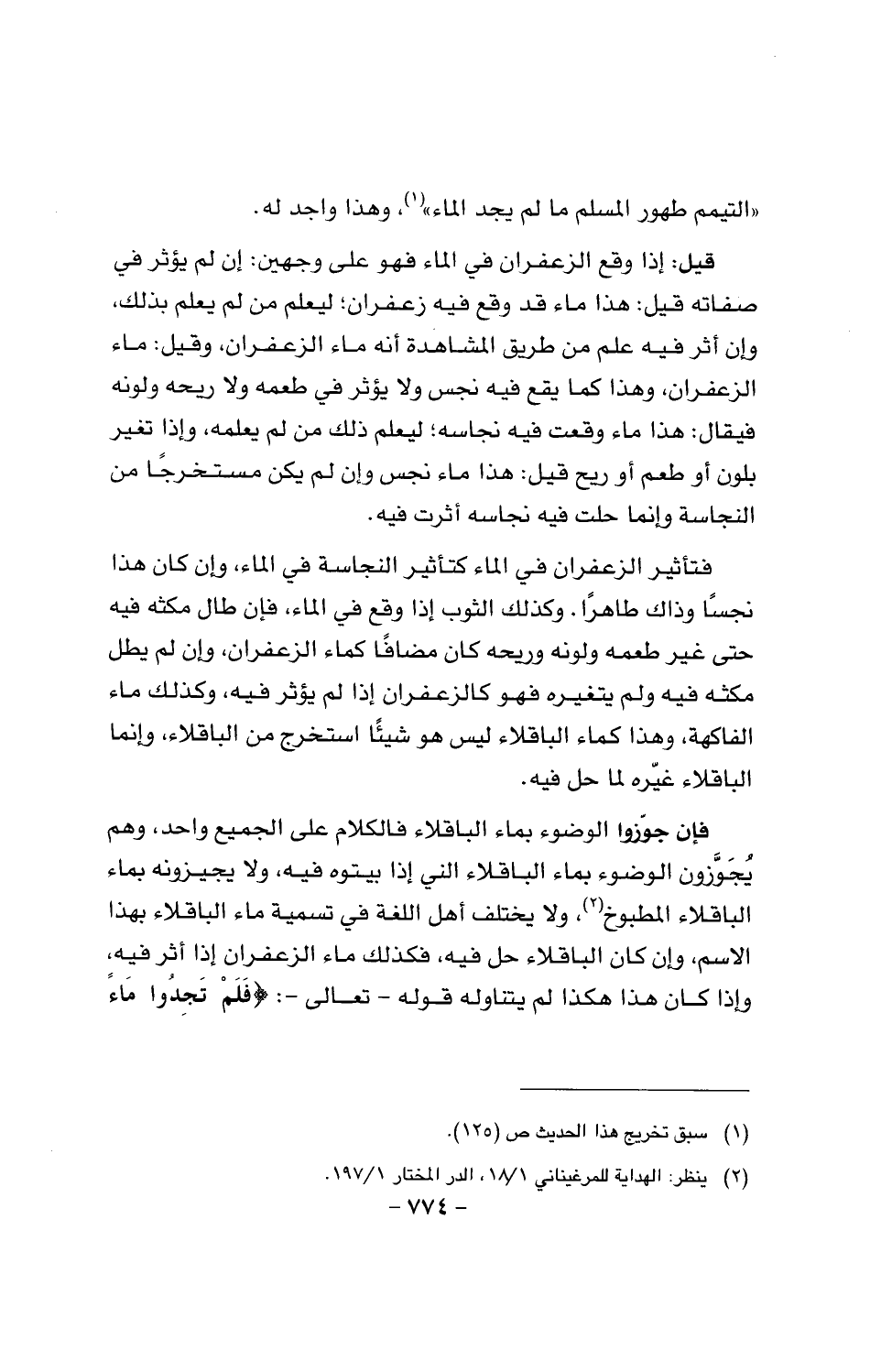 فتأثير الزعفران في الماء كتأثير النجاسة في الماء، وإن كان هذا نجساً وذاك طاهراً. وكذلك الثوب إذا وقع في الماء، فإن طال مكثه فيه حتى غير طعمه ولونه وريحه كان مضافاً كماء الزعفران، وإن لم يطل مكثه فيه ولم يتغيره فهو كالزعفران إذا لم يؤثر فيه، وكذلك ماء الفاكهة، وهذا كما الباقلاء ليس هو شيئاً استخرج من الباقلاء، وإنما الباقلاء غيره لما حل فيه.