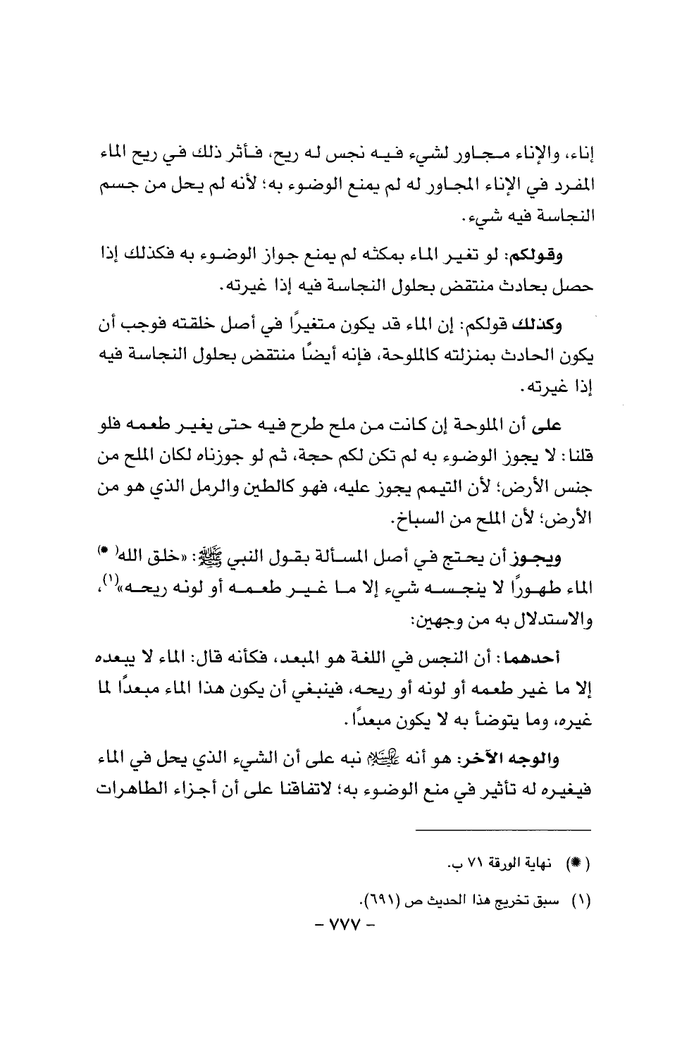 وكذلك قولكم: إن الماء قد يكون متغيرا في أصل خلقته فوجب أن يكون الحادث بمنزلته كالملوحة، فإنه أيضا منتقض بحلول النجاسة فيه إذا غيرته.