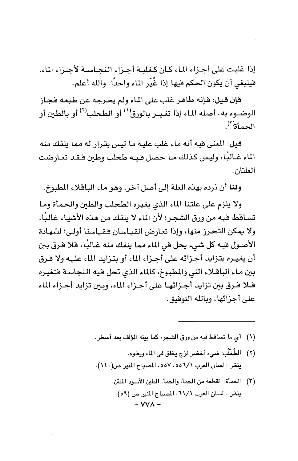 ولا يلزم على علتنا الماء الذي يغريه الطحلب والطين والحمأة وما تساقط فيه من ورق الشجر؛ لأن الماء لا ينفك بهذه الأشياء غالبا، ولا يمنكن التحرز منها، وإذا تعارض القياسان أولى؛ لشهادة الأصول فيه كل شيء يحل في الماء مما ينفك منه غالبا، فلا فرق بين أن يغيره بتزايد أجزائه على أجزاء الماء أو بتزايد الماء عليه ولا فرق بين ماء الباقلاء الني والمطبوخ، كالماء الذي تحل فيه النجاسة فتغيره فلا فرق بين تزايد أجزائها على أجزاء الماء، وبين تزايد أجزاء الماء على أجزائها، وبالله التوفيق.