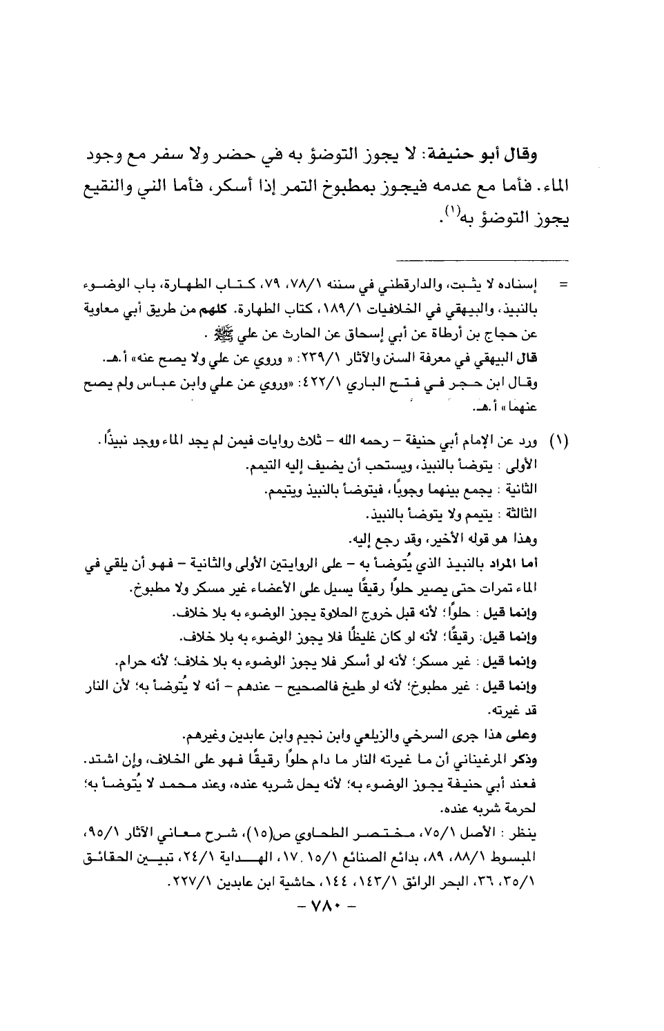 وقال أبو حنيفة: لا يجوز التوضؤ به في حضر ولا سفر مع وجود الماء. فأما مع عدمه فيجوز بمطبوخ التمر إذا أسكر، فأما الني والنقيع يجوز التوضؤ به.