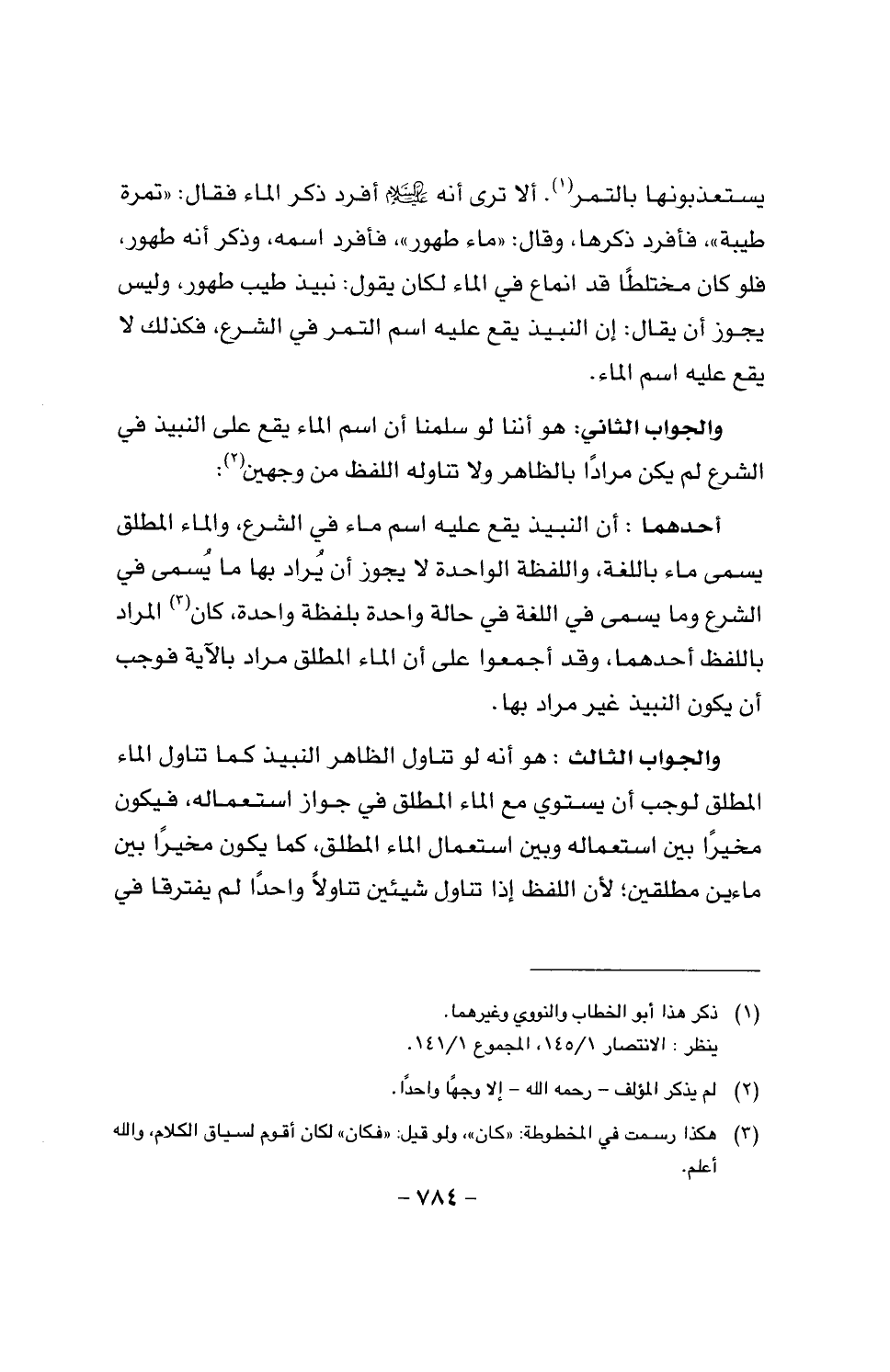 والجواب الثالث: هو أنه لو تناول الظاهر النبيذ كما تناول الماء المطلق لوجب أن يستوي مع الماء المطلق في جواز استعماله، فيكون مخيرا بين استعماله وبين استعمال الماء المطلق، كما يكون مخيرا بين ماءين؛ لأن اللفظ إذا تناول شيئين تناولا واحدا لم يفترقا في الحكم؛