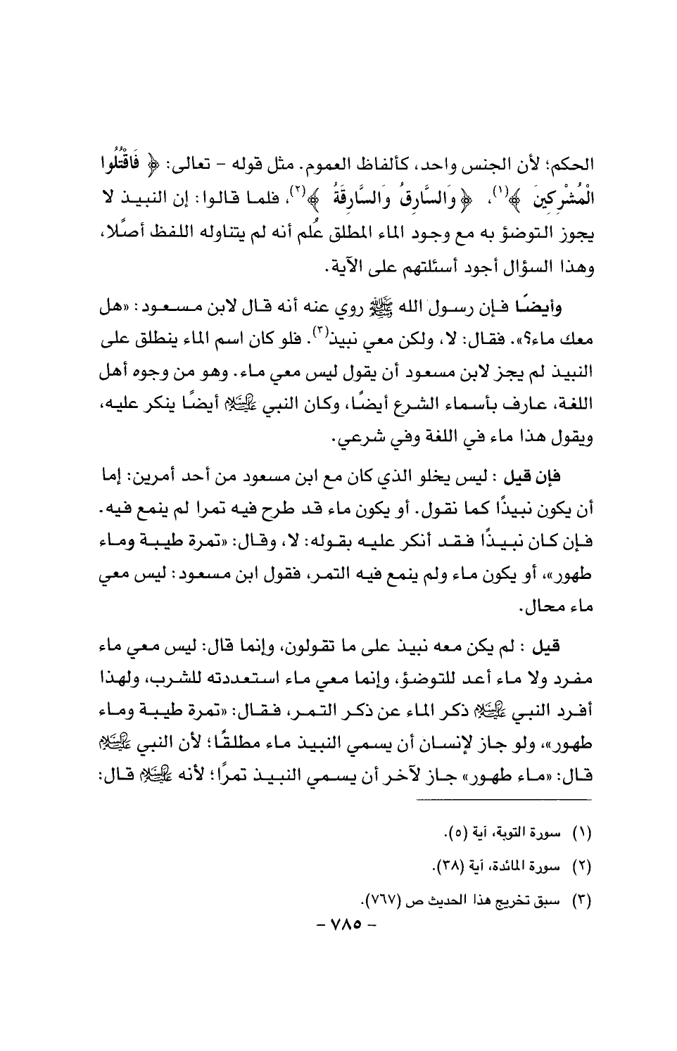 وأيضا فإن رسول الله صَلَّى اللَّهُ عَلَيْهِ وَسَلَّمَ روي عنه أنه قال لابن مسعود: (هل معك ماء؟). فقال: لا، ولكن معي نبيذ. فلو كان اسم الماء ينطلق على النبيذ لم يجز لابن مسعود أن يقول ليس معي ماء. وهو من وجوه أهل اللغة، عارف بأسماء الشرع أيضا، وكان النبي عليه السلام أيضا ينكر عليه، ويقول هذا ماء في اللغة وفي شرعي.