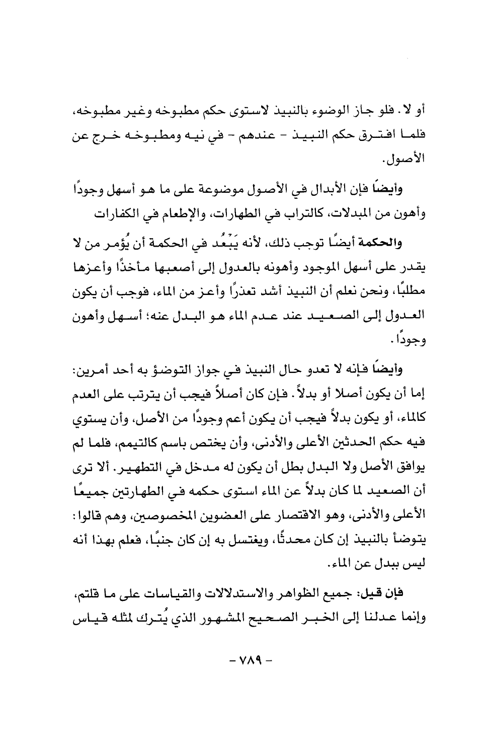 والحكمة أيضا توجب ذلك، لأنه يبعد في الحكمة أن يؤمر من لا يقدر على أسهل الموجود وأهونه بالعدول إلى أصعبها مأخذا وأعزها مطلبا، ونحن نعلم أن النبيذ أشد تعذرا وأعز من الماء، فوجب أن يكون العدول إلى الصعيد عند عدم الماء هو البدل عنه؛ أسهل وأهون وجودا.