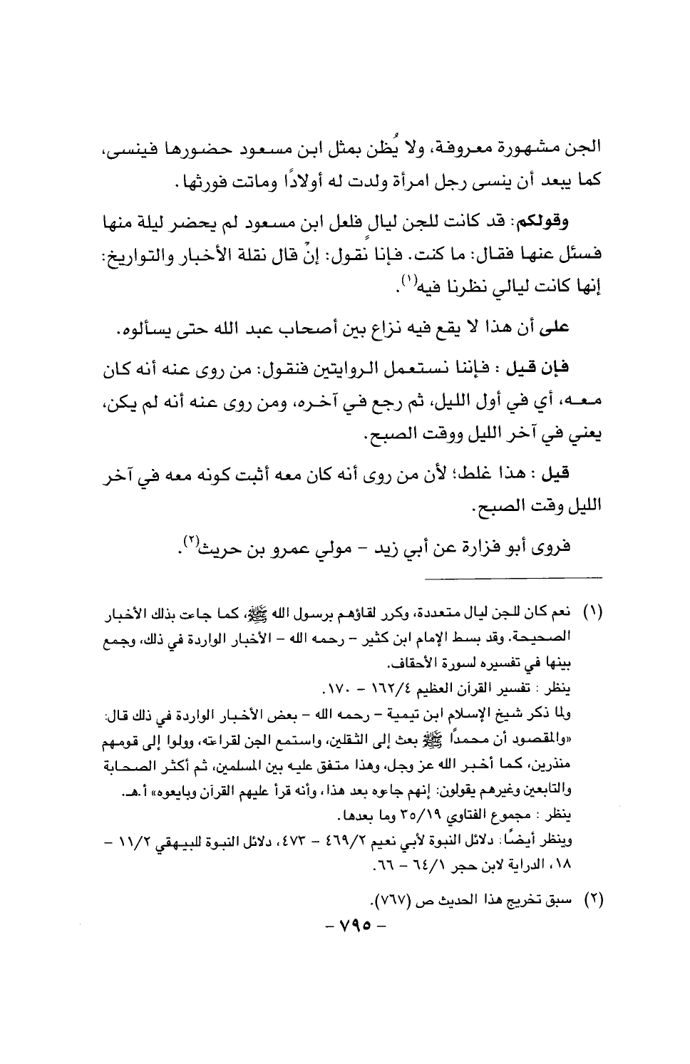 وقولكم: قد كانت للجن ليال فلعل ابن مسعود لم يحضر ليلة منها فسئل عنها فقال: ما كنت. فإنا نقول: إن قال نقلة الأخبار والتواريخ إنها كانت ليالي نظرنا فيه.