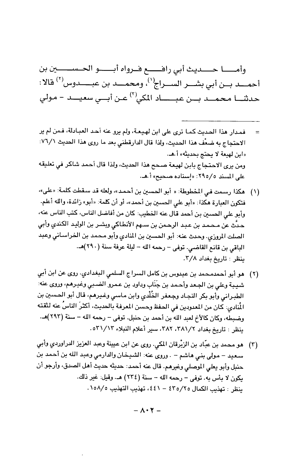 وأما حديث أبي رافع فرواه أبو الحسين بن أحمد بن أبي بشر السراج، ومحمد بن عبدوس قالا: حدثنا محمد بن عباد المكي عن أبي سعيد - مولى