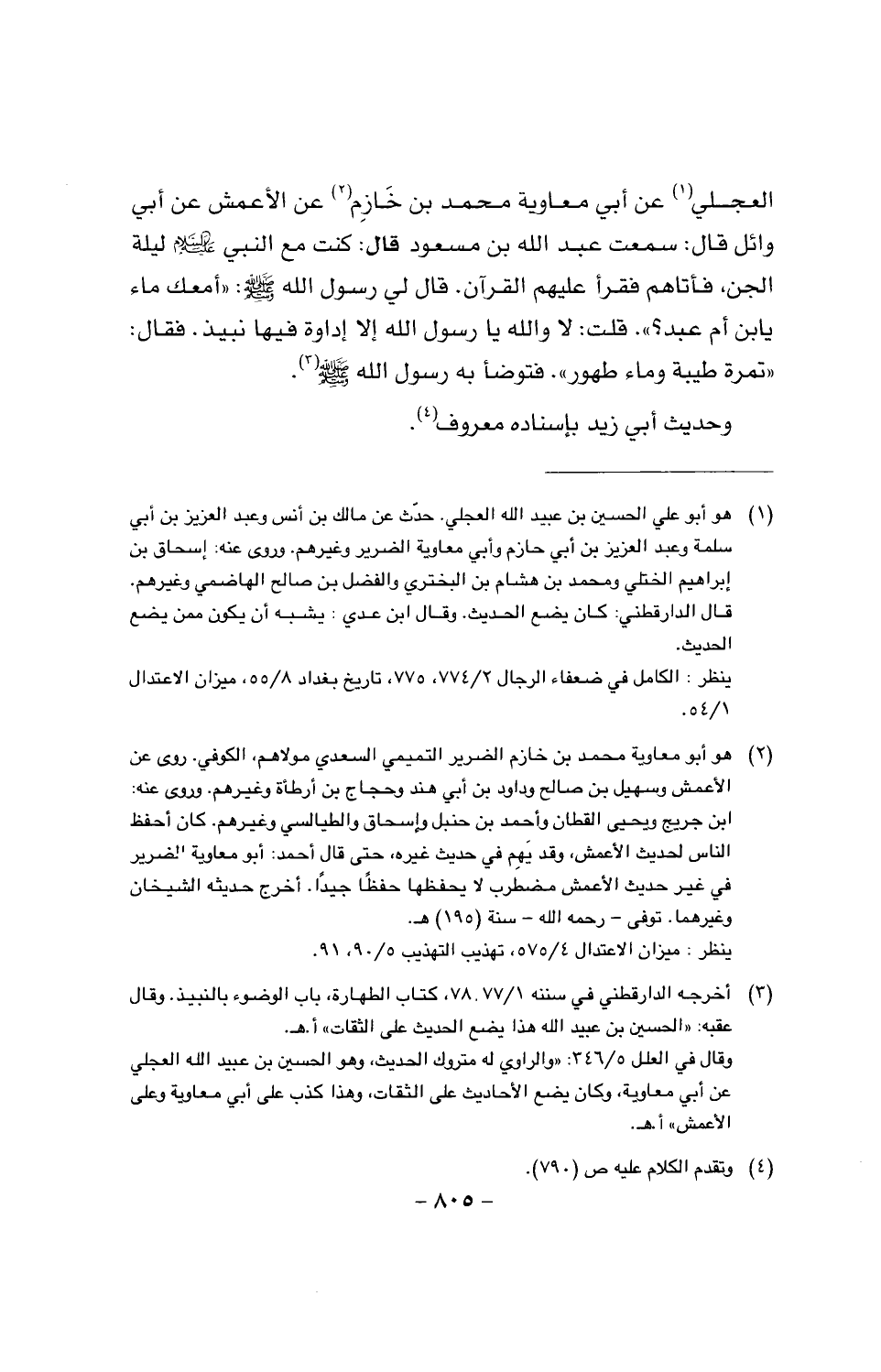 العجلي عن أبي معاوية محمد بن حازم عن الأعمش عن أبي وائل قال: سمعت عبد الله بن مسعود قال: كنت مع النبي عليه السلام ليلة الجن، فأتاهم فقرأ عليهم القرآن. قال لي رسول الله صَلَّى اللَّهُ عَلَيْهِ وَسَلَّمَ: (أمعك ماء يا بن أم عبد؟) قلت: لا والله يا رسول الله إلا إداوة فيها نبيذ. فقال: (تمرة طيبة وماء طهور). فتوضأ به رسول الله صَلَّى اللَّهُ عَلَيْهِ وَسَلَّمَ.