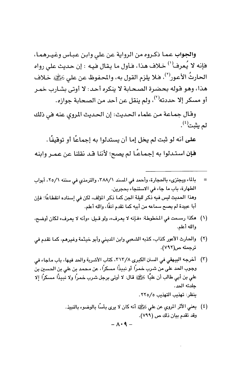 والجواب عما ذكروه من الرواية عن علي وابن عباس وغيرهما، فإنه لا يعرف خلاف هذا، فأول ما يقال فيه: إن حديث علي رواه الحارث الأعور، فلا يلزم القول به، والمحفوظ عن علي رضي الله عنه خلاف هذا، وهو قوله بحضر الصحابة لا ينكره أحد: لا لا أوتى بشارب خمر أو مسكر إلا حددته، ولم ينقل عن أحد من الصحابة جوازه.