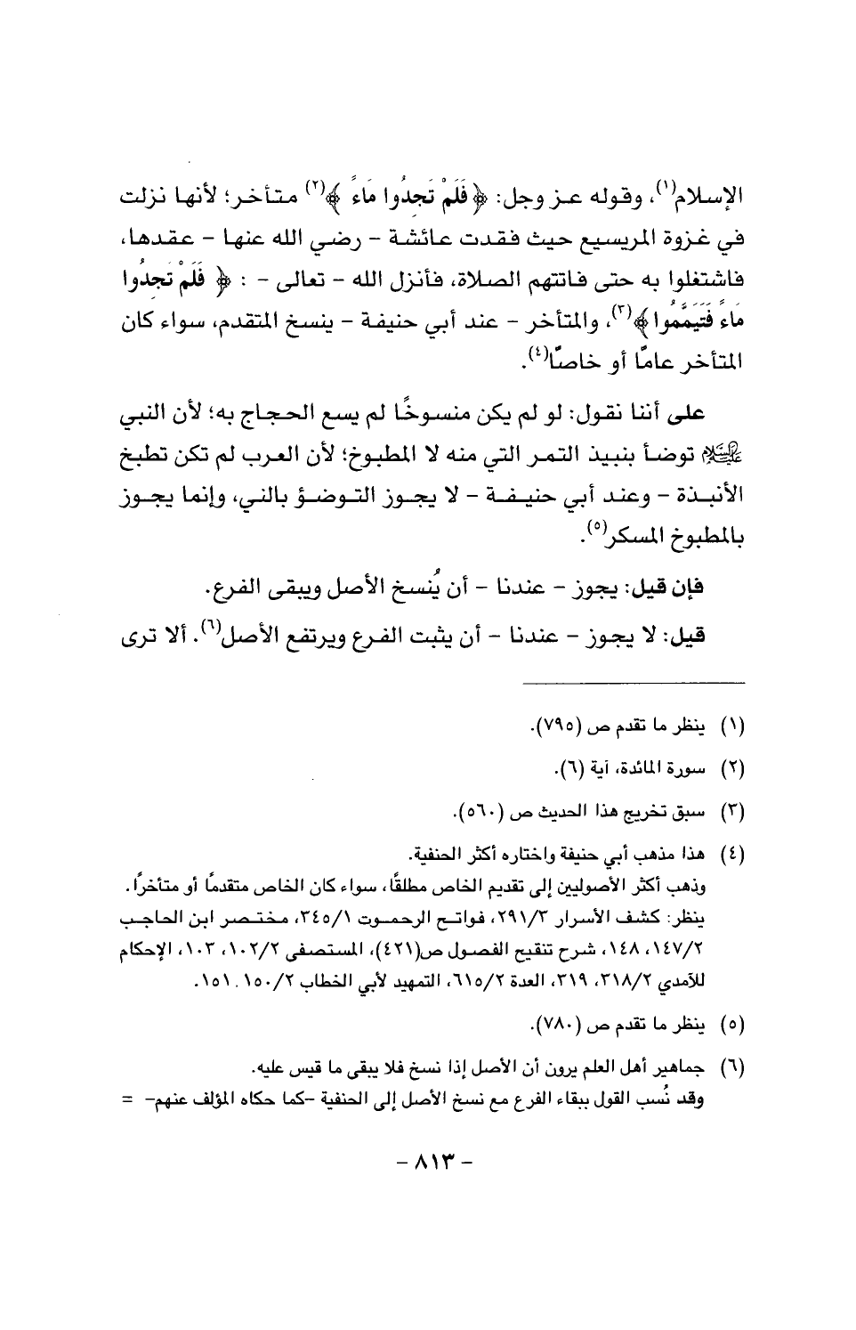 الإسلام، وقوله عز وجل: {فلم تجدوا ماء} متأخر؛ لأنها نزلت في غزوة المريسيع حيث فقدت عائشة - رضي الله عنها - عقدها، فاشتغلوا به حتى فتتهم الصلاة، فأنزل الله - تعالى -: {فلم تجدوا ماء فتيمموا}، والمتأخر - عند أبي حنيفة - ينسخ المتقدم، سواء كان المتأخر عاما أو خاصا.
