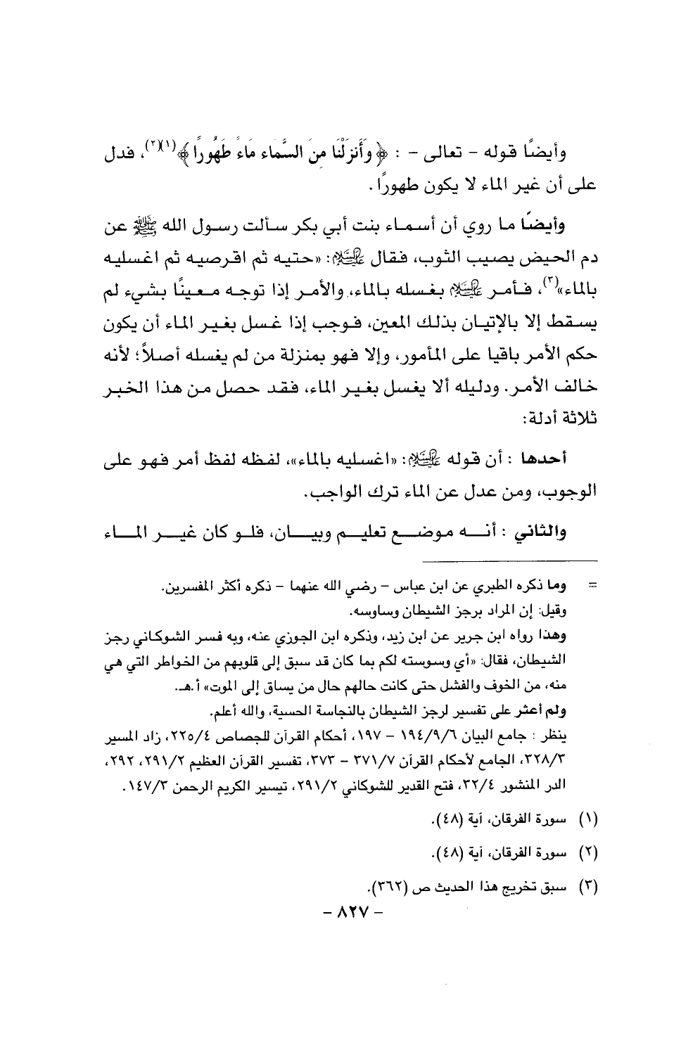 وأيضا ما روي أن أسماء بنت أبي بكر سألت رسول الله صَلَّى اللَّهُ عَلَيْهِ وَسَلَّمَ عن دم الحيض يصيب الثوب، فقال عليه السلام: (حتيه ثم اقرصيه ثم اغسليه بالماء) لا، فأمر عليه السلام بغسله بالماء، والأمر إذا توجه معينا بشيء لم يسقط إلا بالإتيان بذلك المعين، فوجب إذا غسل بغير الماء أن يكون حكم الأمر باقيا على المأمور، وإلا فهو بمنزلة من لم يغسله أصلا؛ لأنه خالف الأمر. ودليله ألا يغسل بغير الماء، فقد حصل من هذا الخبر ثلاثة أدلة: