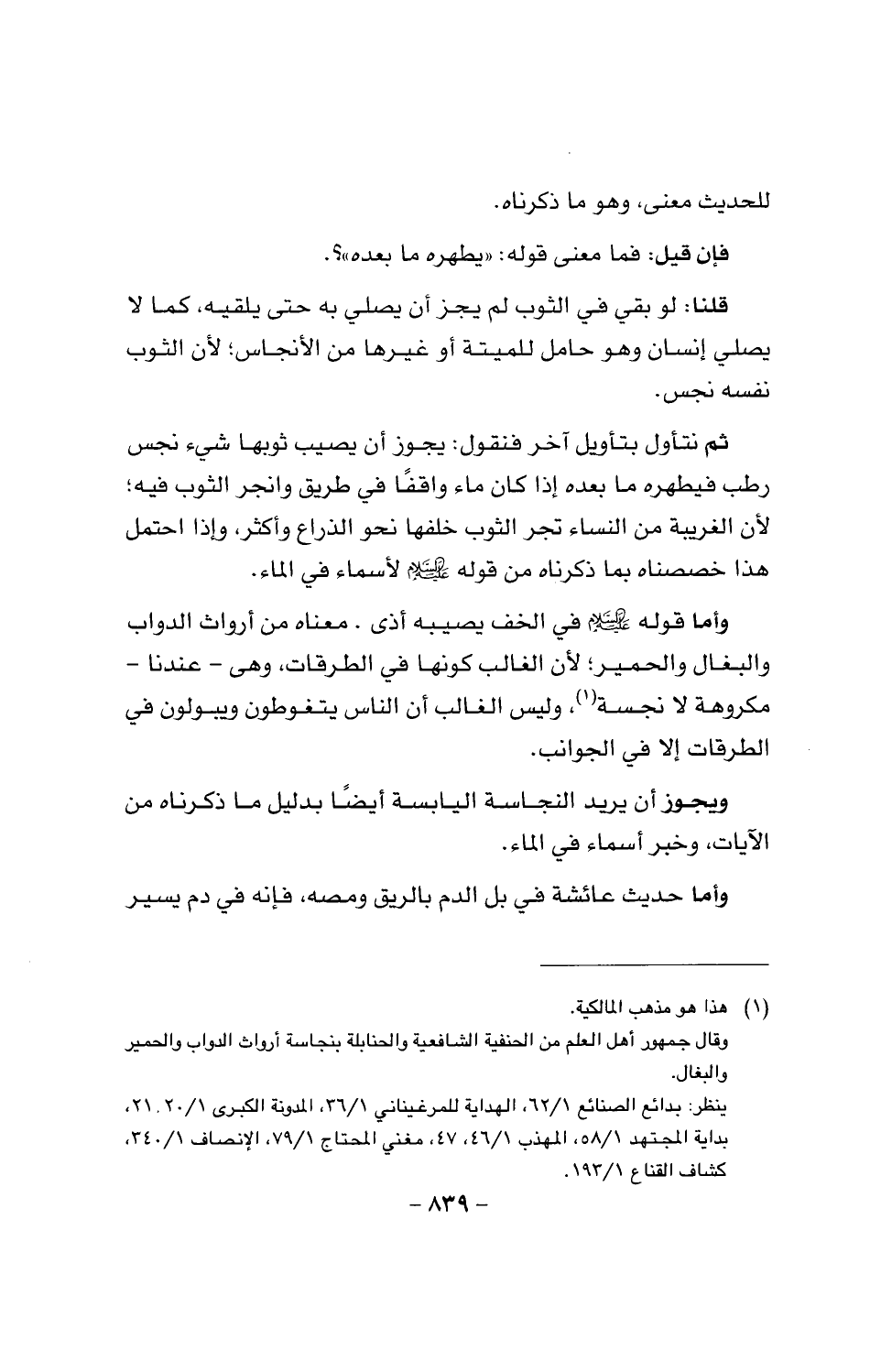 ثم نتأول بتأويل آخر فنقول: يجوز أن يصيب ثوبها شيء نجس رطب فيطهره ما بعده إذا كان ماء واقفا في طرق وانجر الثوب فيه؛ لأن الغريبة من النساء تجر الثوب خلفها نحو الذراع وأكثر، وإذا احتمل هذا خصصناه بما ذكرناه من قوله عليه السلام لأسماء في الماء.
