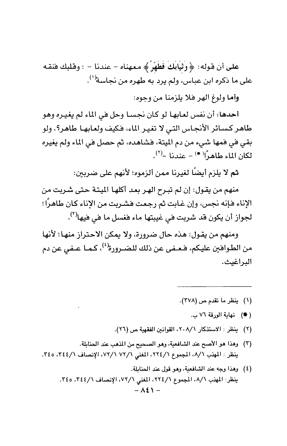 أحدهما: أن نفس لعابها لو كان نجسا وحل في الماء لم يغيره وهو طاهر كسائر الأنجاس التي لا تغير الماء، فكيف ولعابها طاهر؟. ولو بقي في فمها شيء من دم الميتة، فشاهده، ثم حصل في الماء ولم يغيره لكان الماء طاهرا - عندنا -.