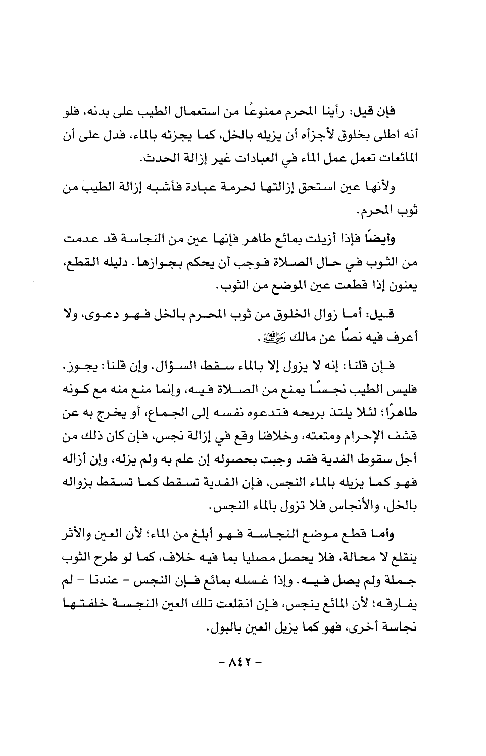 وأيضا فإذا أزيلت بمائع طاهر فإنها عين من النجاسة قد عدمت من الثوب في حال الصلاة فوجب أن يحكم بجوازها. دليله القطع، يعنون إذا قطعت عين الموضع من الثوب.