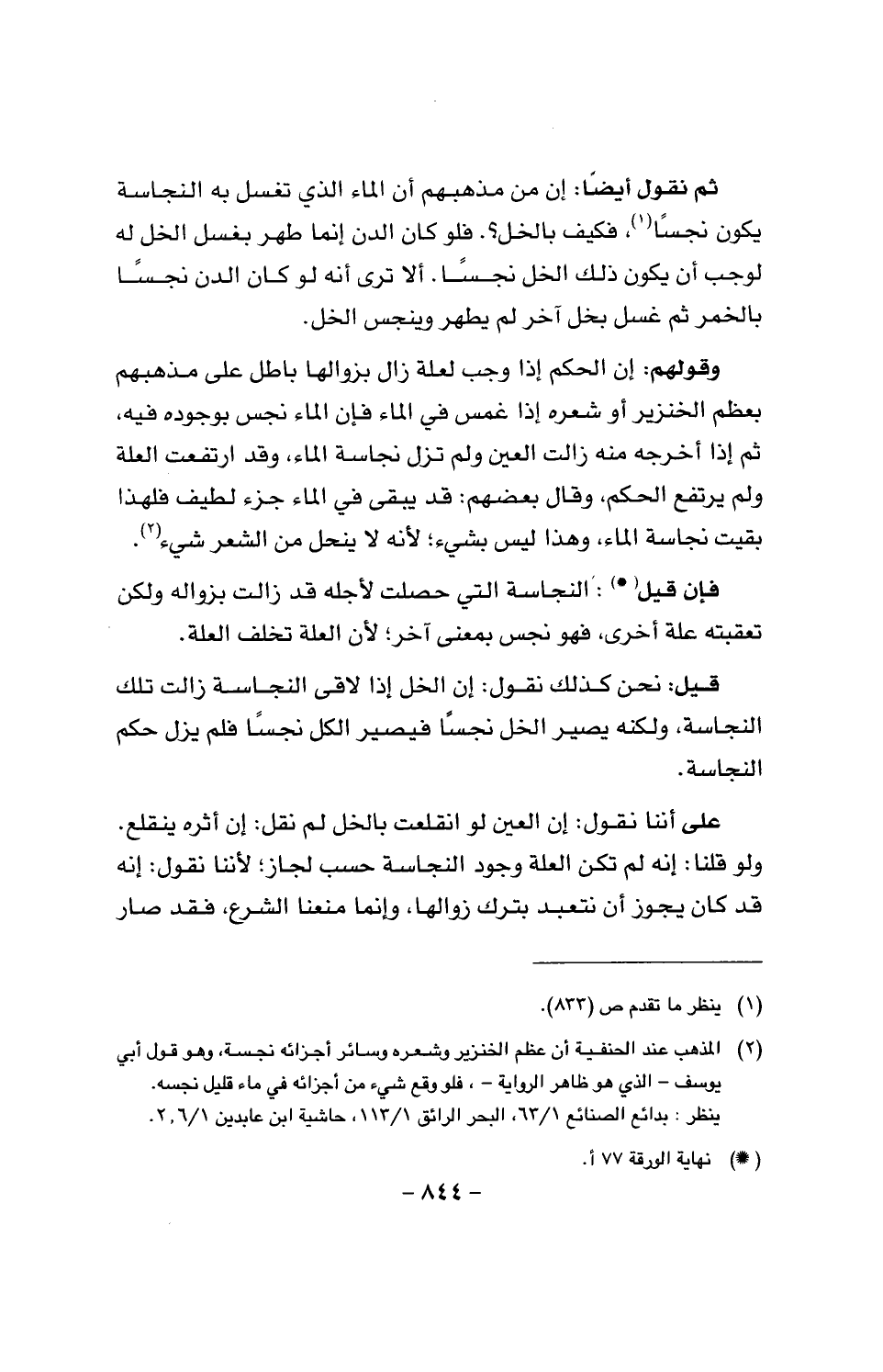 وقولهم: إن الحكم إذا وجب لعلة زال بزوالها باطل على مذهبهم بعظم الخنزير أو شعره إذا غمس في الماء فإن الماء نجس بوجوده فيه، ثم إذا أخرجه منه زالت العين ولم تزل نجاسة الماء، وقد ارتفعت العلة ولم يرتفع الحكم، وقال بعضهم: قد يبقى في الماء جزء لطيف فلهذا بقيت نجاسة الماء، وهذا ليس بشيء؛ لأنه لا ينحل من الشعر شيء.
