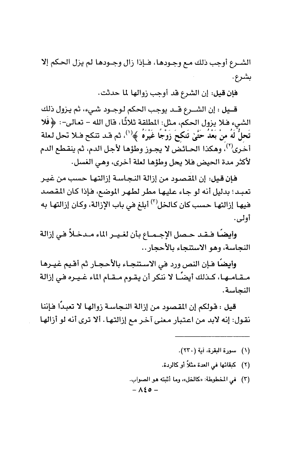 قيل: إن الشرع قد يوجب الحكم لوجود شيء، ثم يزول ذلك الشيء فلا يزول الحكم، مثل: المطلقة ثلاثا، قال الله - تعالى -: {فلا تحل له من بعد حتى تنكح زوجا غيره}، ثم قد تنكح فلا تحل لعلة أخرى، وهكذا الحائض لا يجوز وطؤها لأجل الدم، ثم ينقطع الدم لأكثر مدة الحيض فلا يحل وطؤها لعلة أخرى، وهي الغسل.