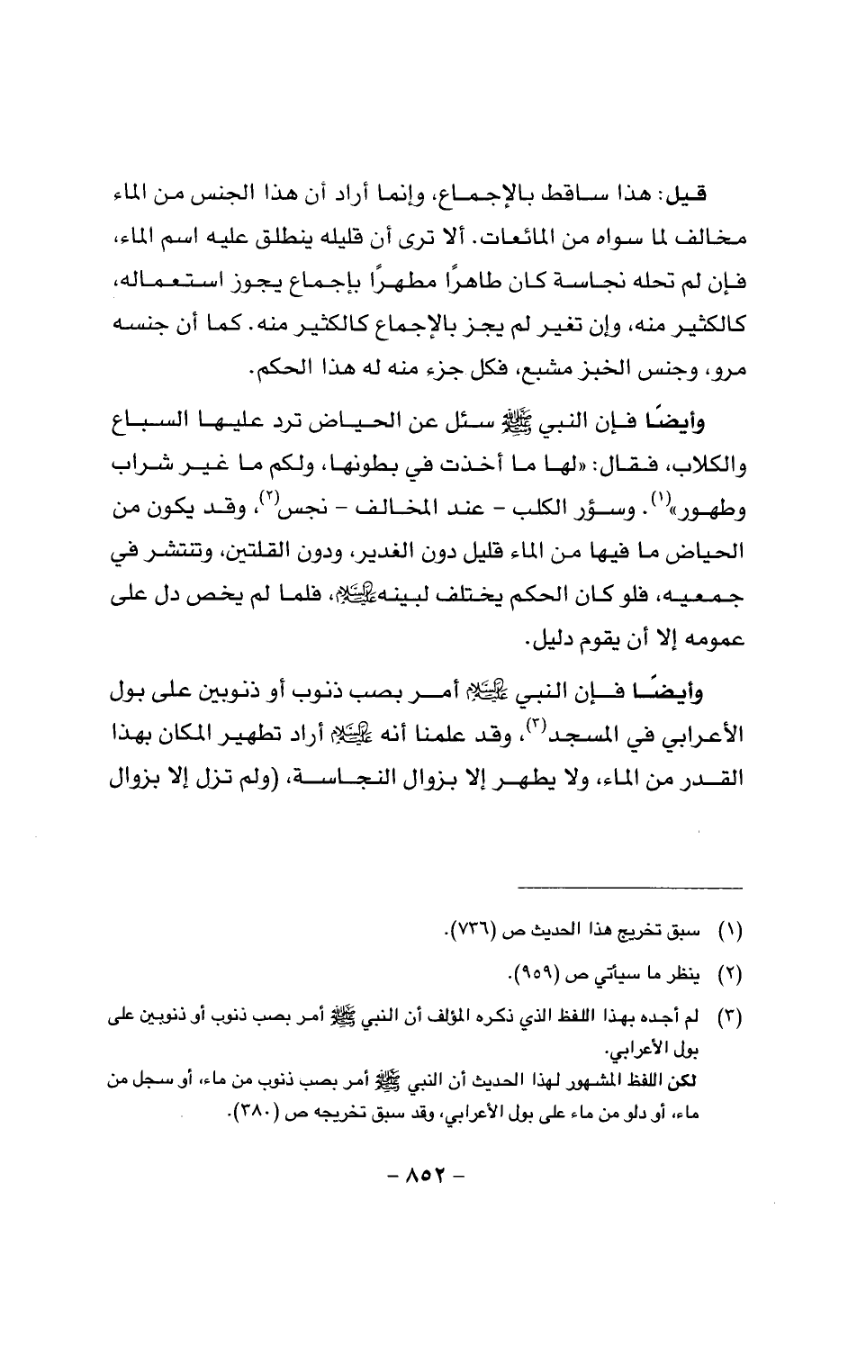 وأيضا فإن النبي صَلَّى اللَّهُ عَلَيْهِ وَسَلَّمَ سئل عن الحياض ترد عليها السباع والكلاب، فقال: (لها ما أخذت في بطونها، ولكم ما غير شراب وطهور). وسؤر الكلب - عند المخالف - نجس، وقد يكون من الحياض ما فيها من الماء قليل دون الغدير، ودون القلتين، وتنتشر في جميعه، فلو كان الحكم يختلف لبينه عليه السلام، فلما لم يخص دل على عمومه إلا أن يقوم دليل.