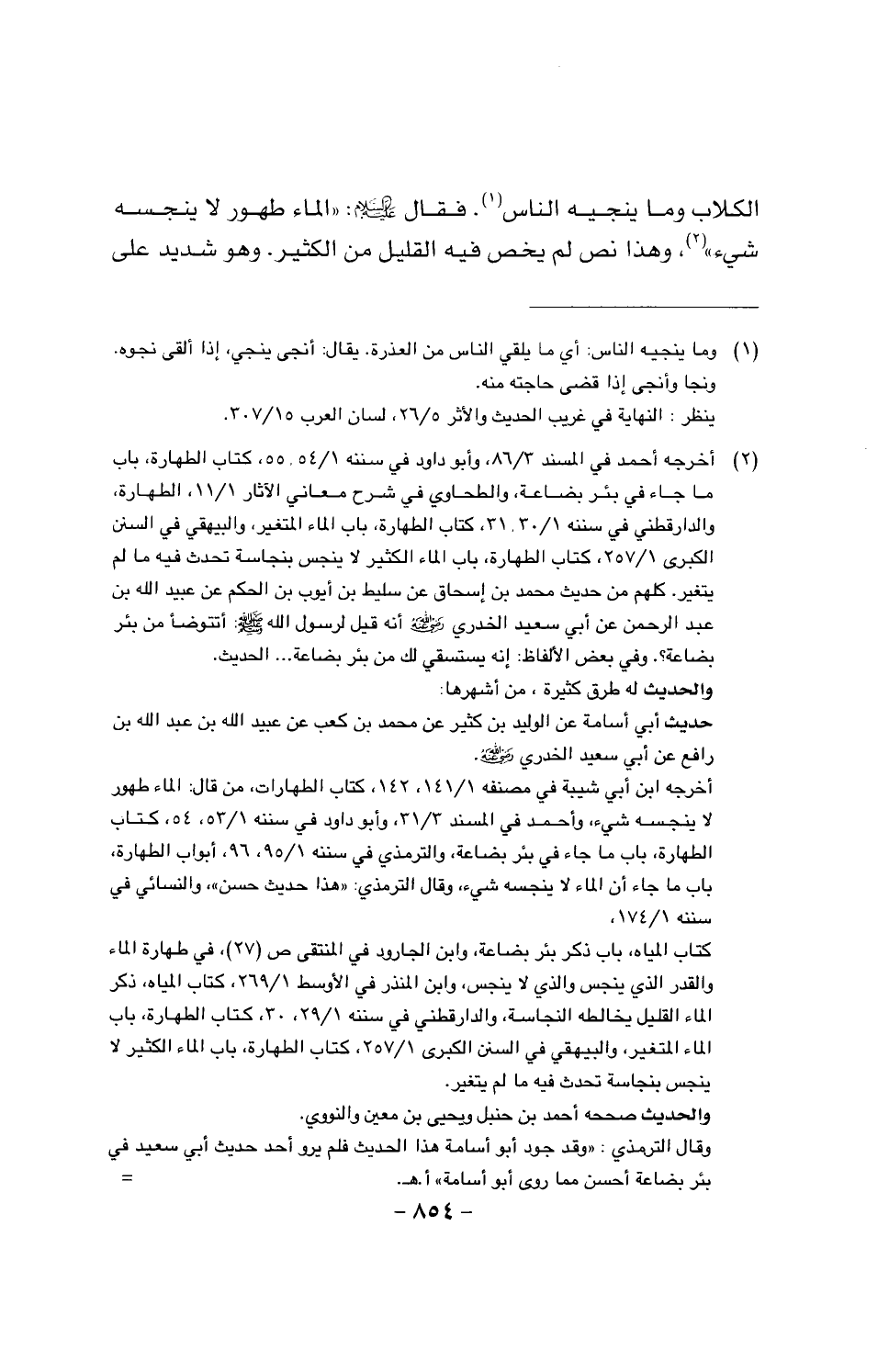 الكلاب وما ينجيه الناس. فقال عليه السلام: (الماء طهور لا ينجسه شيء) وهذا نص لم يخص فيه القليل من الكثير. وهو شديد على