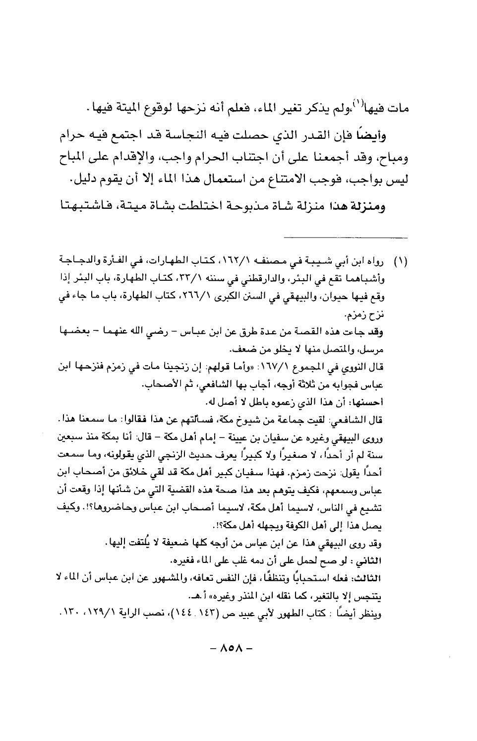 وأيضا فإن القدر الذي حصلت فيه النجاسة قد اجتمع فيه حرام ومباح، وقد أجمعنا على أن اجتناب الحرام واجب، والإقدام على المباح ليس بواجب، فوجب الامتناع من استعمال هذا الماء إلا أن يقوم دليل.