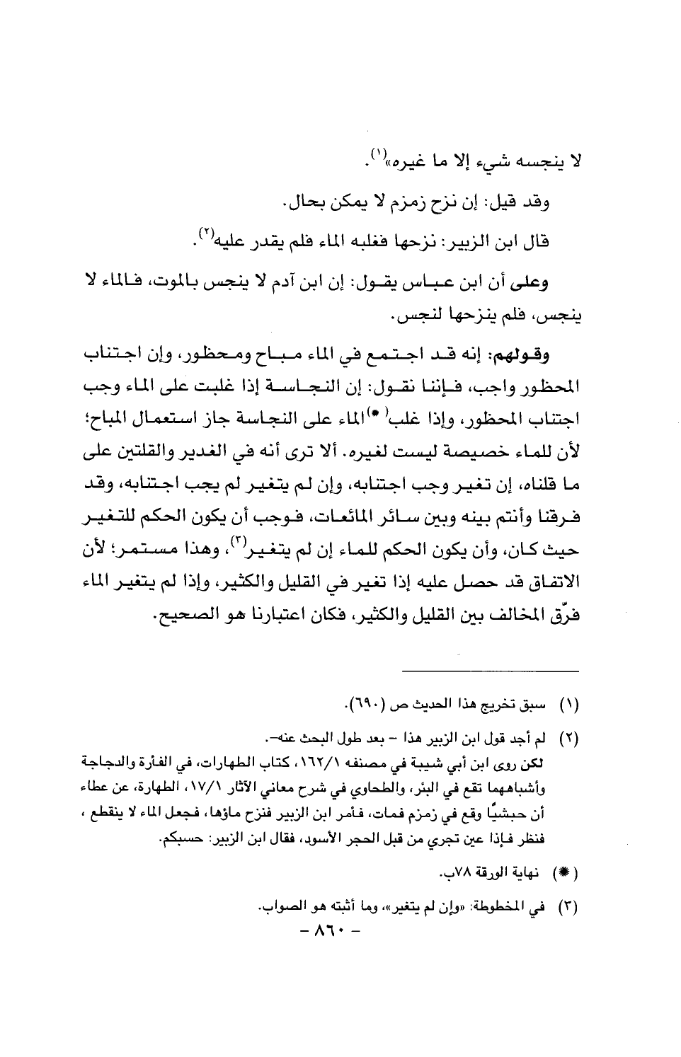 وقولهم: إنه قد اجتمع في الماء مباح ومحظور، وإن اجتناب المحظور واجب، فإننا نقول: إن النجاسة إذا غلبت على الماء وجب اجتناب المحظور، وإذا غلب الماء على النجاسة جاز استعمال المباح؛ لأن للماء خصيصة ليست لغيره. ألا ترى أنه في الغدير والقلتين على ما قلناه، إن تغير وجب اجتنابه، وإن لم يتغير لم يجب اجتنابه، وقد فرقنا وأنتم بينه وبين سائر المائعات، فوجب أن يكون الحكم للتغير حيث كان، وأن يكون الحكم للماء إن يتغير، وهذا مستمر؛ لأن الاتفاق قد حصل عليه إذا تغير في القليل والكثير، وإذا لم يتغير الماء فرق المخالف بين القليل والكثير، فكان اعتبارنا هو الصحيح.