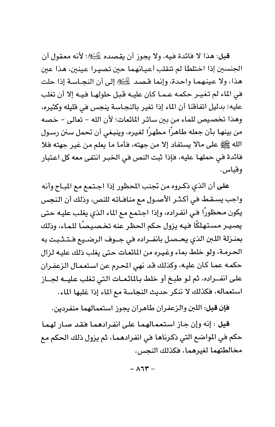 على أن الذي ذكروه من تجنب المحظور إذا اجتمع مع المباح وأنه واجب يسقط في أكثر الأصول مع منافاته للنص، وذلك أن النجس يكون محظورا في انفراده، وإذا اجتمع مع الماء يغلب عليه حتى يصير مستهلكا فيه يزول حكم الحظر عنه تخصيصا للماء، وذلك بمنزلة اللبن الذي يحصل بانفراده في جوف الرضيع فتثبت به الحرمة، ولو خلط بماء وغيره من المائعات حتى يغلب ذلك عليه لزال حكمه عما كان عليه، وكذلك قد نهي المحرم عن استعمال الزعفران على انفراده، ثم لو طبخ أو خلط بالمائعات التي تغلب عليه لجاز استعماله، فكذلك لا ننكر حديث النجاسة مع الماء إذا غلبها الماء.