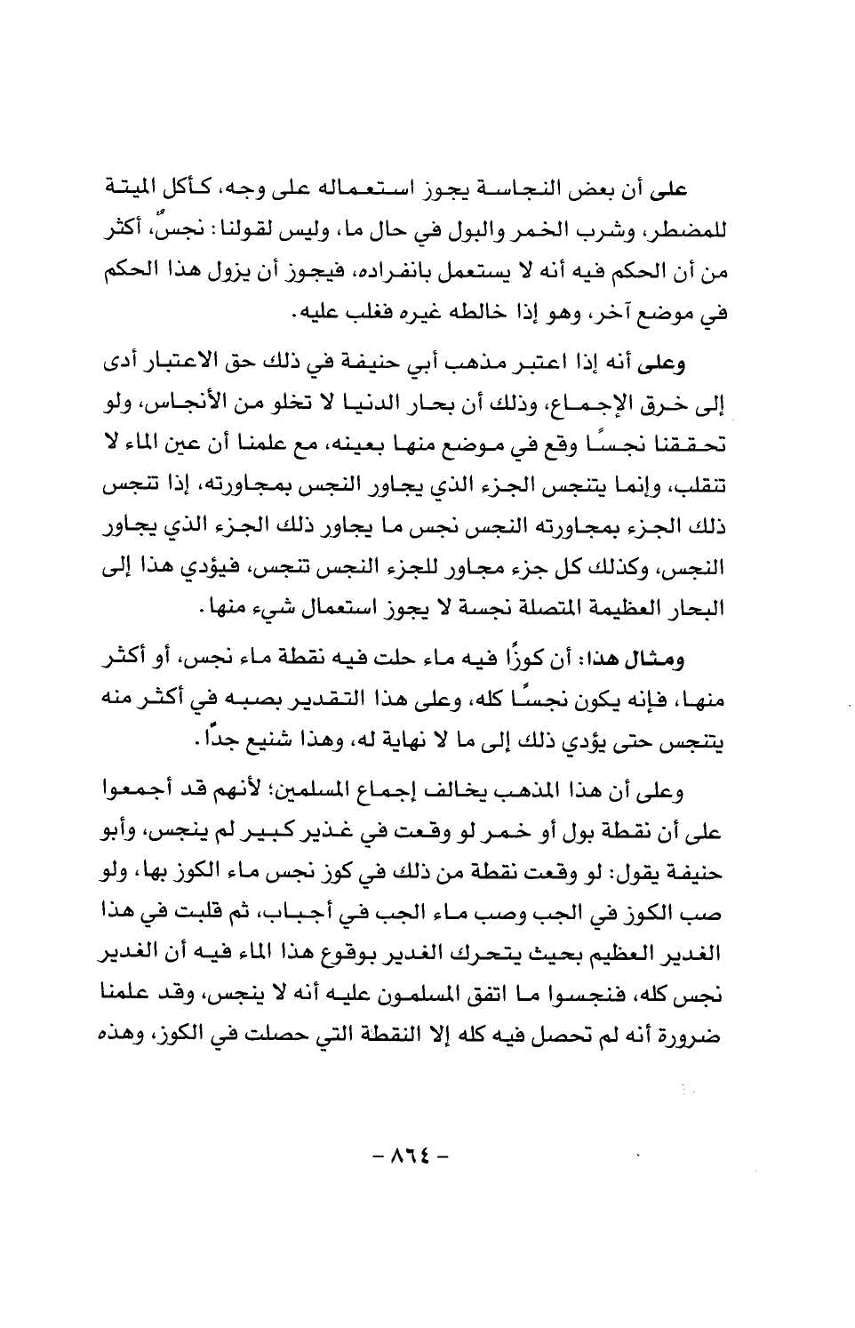 وعلى أنه إذا اعتبر مذهب أبي حنيفة في ذلك حق الاعتبار أدى إلى خرق الإجماع، وذلك أن بحار الدنيا لا تخلو من الأنجاس، ولو تحققنا نجسا وقع في موضع منها بعينه، مع علمنا أن عين الماء لا تنقلب، وإنما يتنجس الجزء الذي يجاور النجس بمجاورته، إذا تنجس ذلك الجزء بمجاورته النجس نجس ما يجاور ذلك الجزء الذي يجاور النجس، وكذلك كل جزء مجاور للجزء النجس تنجس، فيؤدي هذا إلى البحار العظيمة المتصلة نجسة لا يجوز استعمال شيء منها.