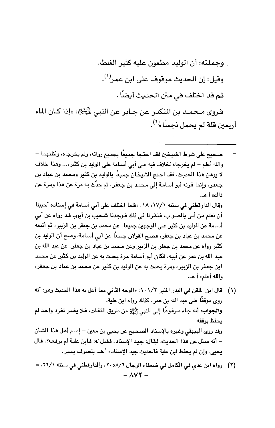 فروى محمد بن المنكدر عن جابر عن النبي عليه السلام: (إذا كان الماء أربعين قلة لم يحمل نجسا).