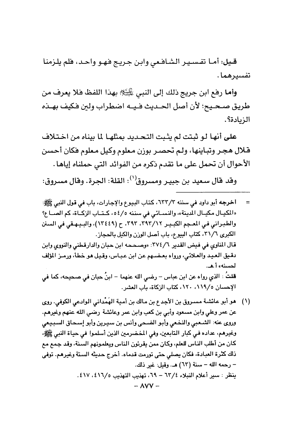 على أنها لو ثبتت لم يثبت التحديد بمثلها لما بيناه من اختلاف قلال هجر وتباينها، ولم تحصر بوزن معلوم وكيل معلوم فكان أحسن الأحوال أن تحمل على ما تقدم ذكره من الفوائد التي حملناه إياها.