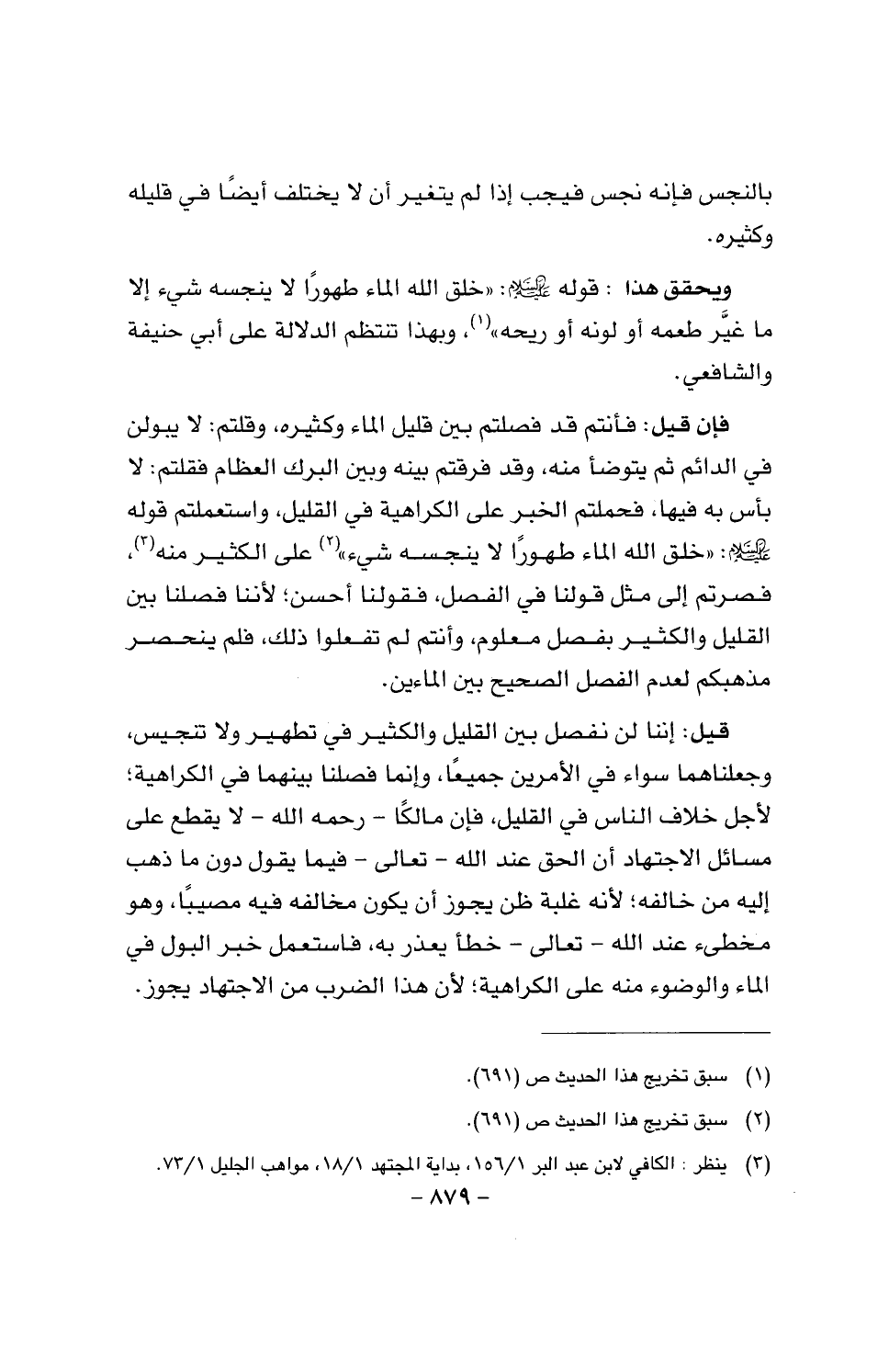قيل: إننا لن نفصل بين القليل والكثير في تطهير ولا تنجيس، وجعلناهما سواء في الأمرين جميعا، وإنما فصلنا بينهما في الكراهية؛ لأجل خلف الناس في القليل، فإن مالكا - رَحمَه الله - لا يقطع على مسائل الاجتهاد أن الحق عند الله - تعالى - فيما يقول دون ما ذهب إليه من خالفه؛ لأنه غلبة ظن يجوز أن يكون مخالفه فيه مصيبا، وهو مخطئ عند الله - تعالى - خطأ يعذر به، فاستعمل خبر البول في الماء والوضوء منه على الكراهية؛ لأن هذا الضرب نم الاجتهاد يجوز.