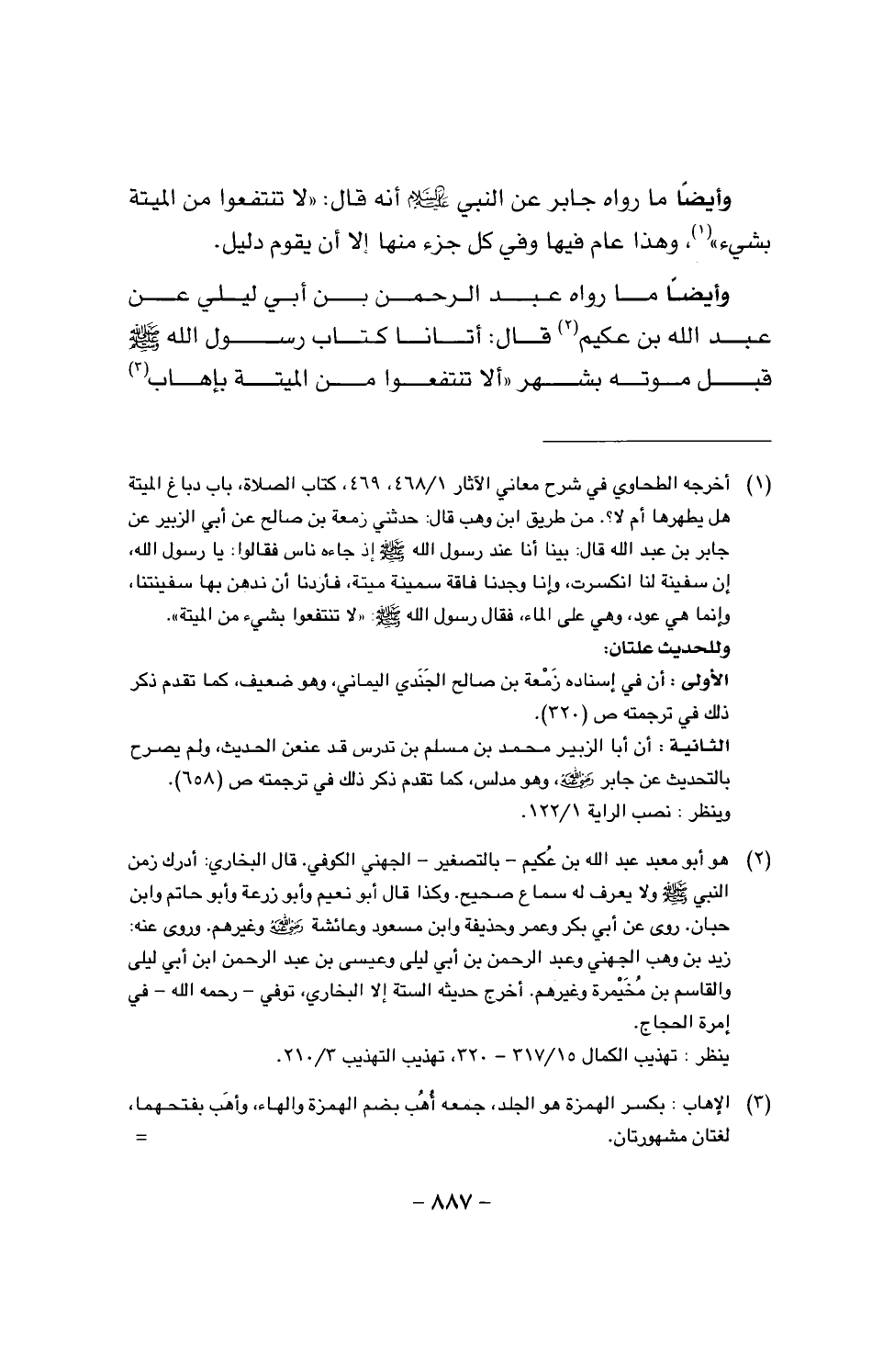 وأيضا ما رواه عبد الرحمن بن أبي ليلي عن عبد الله بن عكيم قال: أتانا كتاب رسول الله صَلَّى اللَّهُ عَلَيْهِ وَسَلَّمَ قبل موته بشهر (ألا تنتفعوا من الميتة بإهاب