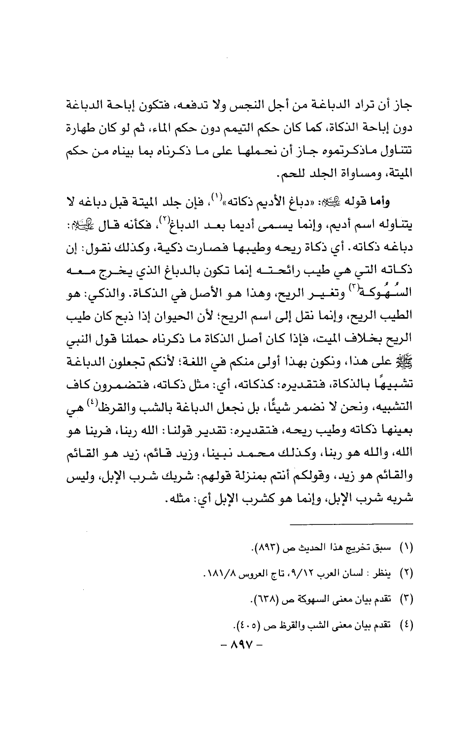 وأما قوله عليه السلام: (دباغ الأديم ذكاته)، فإن جلد الميتة قبل دباغه لا يتناوله اسم أديم، وإنما يسمى أديما بعد الدباغ، فكأنه قال عليه السلام: دباغه ذكاته. أي ذكاته ريحه طيبها فصارت ذكية، وكذلك نقول: إن ذكاته التي هي طيب رائحته إنما تكون بالدباغ الذي يخرج معه السهوكة وتغير الريح، وهذا هو الأصل في الذكاة. والذكي: هو الطيب الريح، وإنما نقل إلى اسم الريح؛ لأن الحيوان إذا ذبح كان طيب الريح بخلاف الميت، فإذا كان أصل الذكاة ما ذكرناه حملنا قول النبي عليه السلام على هذا، ونكون بهذا أولى منكم في اللغة؛ لأنكم تجعلون الدباغة تشبيها بالذكاة، فتقديره: كذكاته، أي: مثل ذكاته، فتضمرون كاف التشبيه، ونحن لا نضمر شيئا، بل نجعل الدباغة بالشب والقرظ هي بعينها ذكاته وطيب ريحه، فتقديره: تقديره قولنا: الله ربنا، فربنا هو الله، والله هو ربنا، وكذلك محمد نبينا، وزيد قائم، زيد هو القائم والقائم هو زيد، وقولكم أنتم بمنزلة قولهم: شربك شرب الإبل، وليس شربه شرب الإبل، وإنما هو كشرب الإبل أي: مثله.