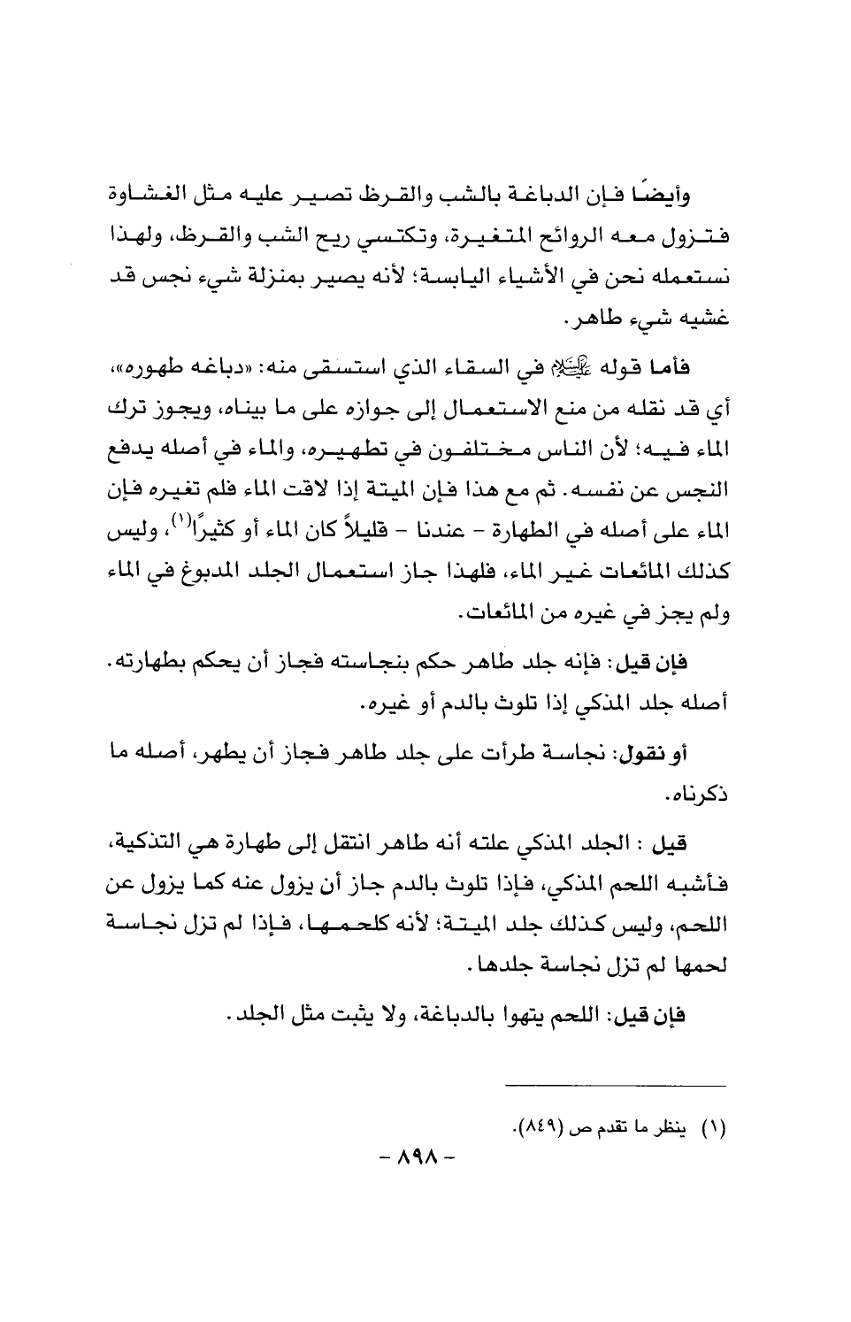 وأيضا فإن الدباغة بالشب والقرظ تصير عليه مثل الغشاوة فتزول معه الروائح المتغيرة، وتكتسي ريح الشب والقرظ، ولهذا نستعمله نحن في الأشياء اليابسة؛ لأنه يصر بمنزلة شيء قد غشيه شيء طاهر.