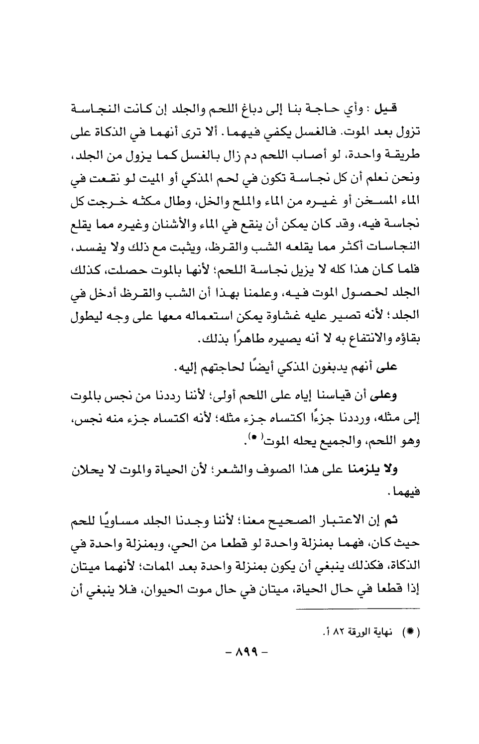 ثم إن الاعتبار الصحيح معنا؛ لأننا وجدنا الجلد مساويا للحم حيث كان، فهما بمنزلة واحدة لو قطعا من الحي، وبمنزلة واحدة في الذكاة، فكذلك ينبغي أن يكون بمنزلة واحدة بعد الممات؛ لأنهما ميتان إذا قطعا في حال الحياة، ميتان في حال موت الحيوان، فلا ينبغي أن