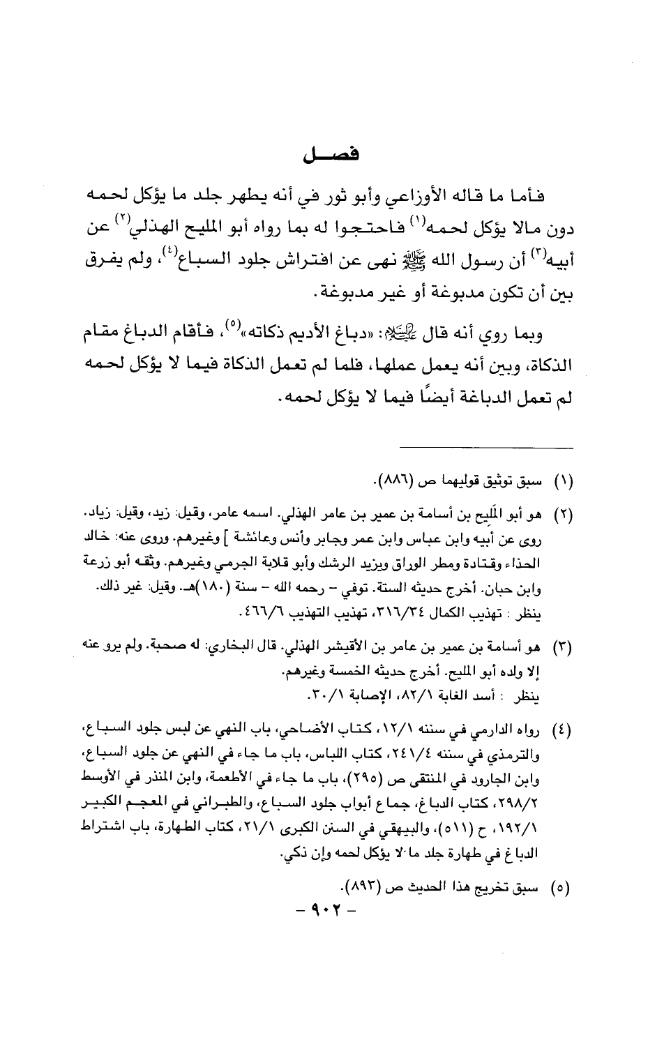 فأما ما قاله الأوزاعي وأبو ثور في أنه يطهر جلد ما يؤكل لحمه دون مالا يؤكل لحمه فاحتجوا له بما رواه المليح الهزلي عن أبيه أن رسول الله صَلَّى اللَّهُ عَلَيْهِ وَسَلَّمَ نهى عن افتراش جلود السباع، ولم يفرق بين أن تكون مدبوغة أو غير مدبوغة.