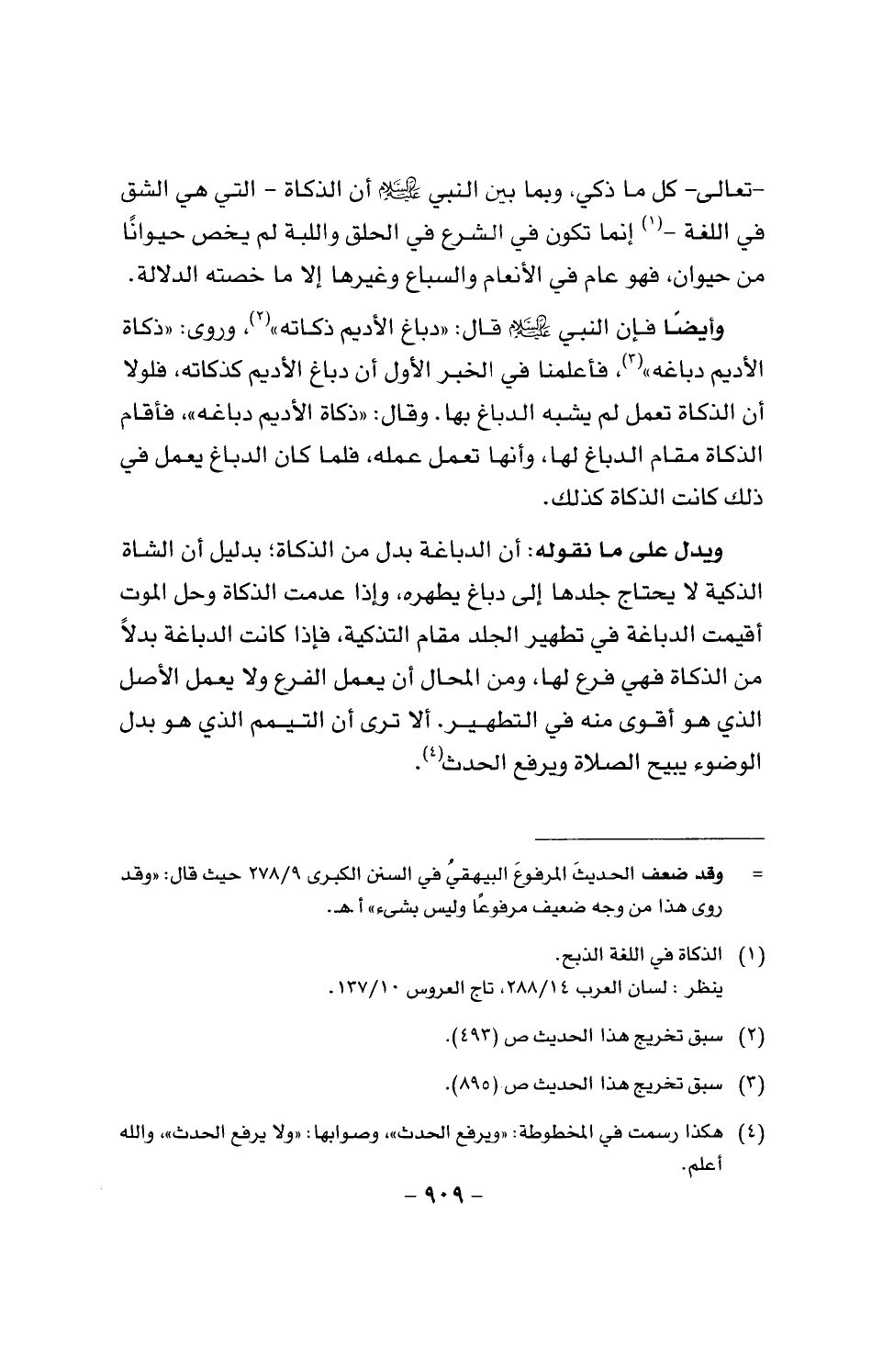 وأيضا فإن النبي عليه السلام قال: (دباغ الأديم ذكاته)، وروي: (ذكاة الأديم دباغه)، فأعلمنا في الخبر الأول أن دباغ الأديم كذكاته، فلولا أن الذكاة تعمل لم يشبه الدباغ بها. وقال: (ذكاة الأديم دباغه)، فأقام الذكاة مقام الدباغ لها، وأنها تعمل عمله، فلما كان الدباغ يعمل في ذلك كانت الذكاة كذلك.