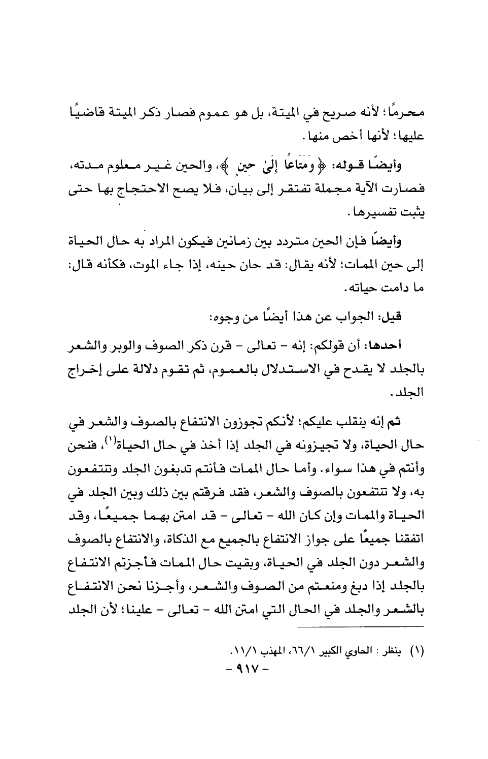 ثم إنه ينقلب عليكم؛ لأنكم تجوزون الانتفاع بالصوف والشعر في حال الحياة، ولا تجيزونه في الجلد إذا أخذ فيحال الحياة، فنحن وأنتم في هذا سواء. وأما حال الممات فأنتم تدبغون الجلد وتنتفعون به، ولا تنتفعون بالصوف والشعر، فقد فرقتم بين ذلك وبين الجلد في الحياة والممات وإن كان الله - تعالى - قد امتن بهما جميعا، وقد اتفقنا جميعا على جواز الانتفاع بالجميع مع الذكاة، والانتفاع بالصوف والشعر دون الجلد في الحياة، وبقيت حال الممات فأجزتم الانتفاع بالجلد إذا دبغ ومنعتم من الصوف والشعر، وأجزنا نحن الانتفاع بالشعر والجلد في الحال التي امتن الله - تعالى - علينا؛ لأن الجلد