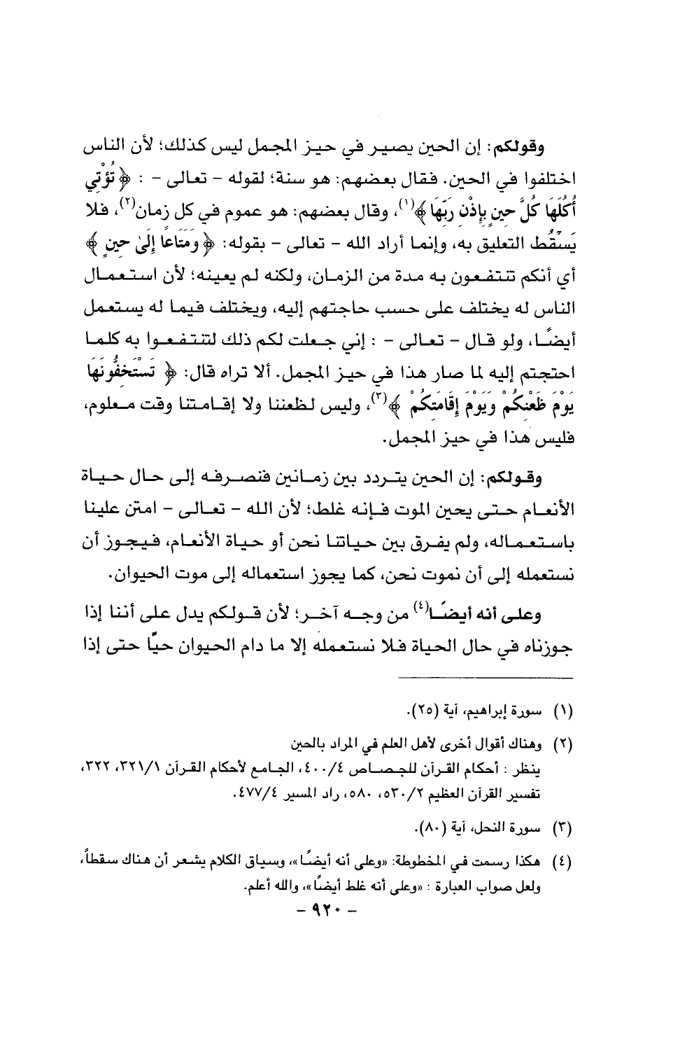 وقولكم: إن الحين يتردد بين زماننين فنصرفه إلى حال حياة الأنعام حتى يحين الموت فإنه غلط؛ لأنه الله - تعالى - امتن علينا باستعماله، ولم يفرق بين حياتنا نحن أو حياة الأنعام، فيجوز أن نستعمله إلى أن نموت نحن، كما يجوز استعماله إلى موت الحيوان.