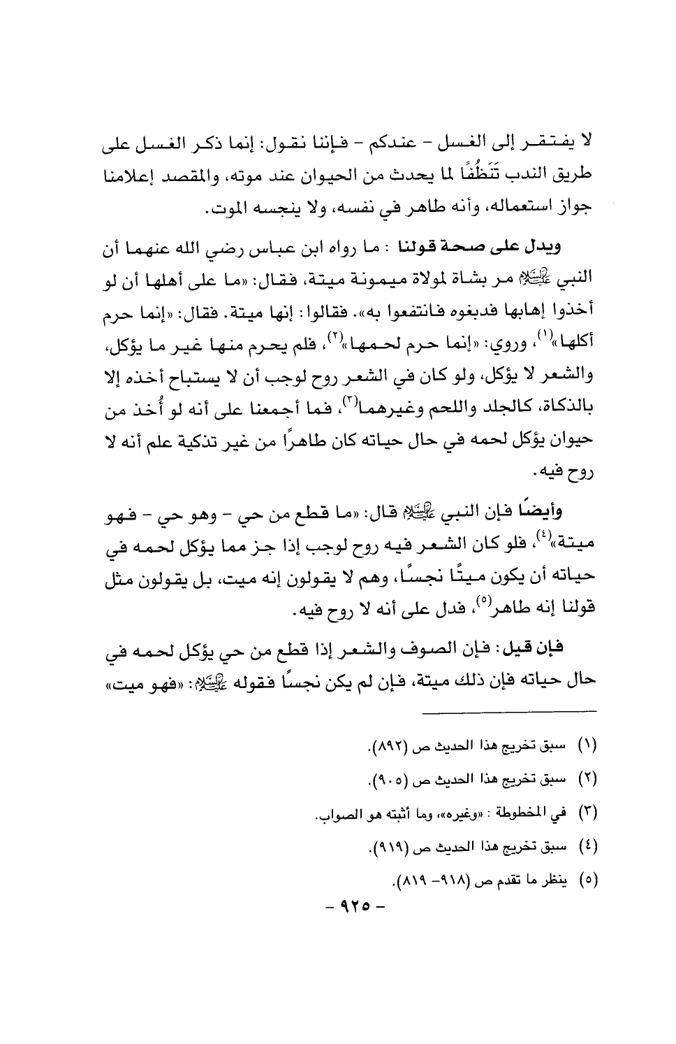 وأيضا فإن النبي عليه السلام قال: (ما قطع من حي - وهو حي - فهو ميتة)، فلو كان الشعر فيه روح لوجب إذا جز مما يؤكل لحمه في حياته أن يكون ميتا نجسا، وهم لا يقولون إنه ميت، بل يقولون مثل قولنا إنه طاهر، فدل على أنه لا روح فيه.