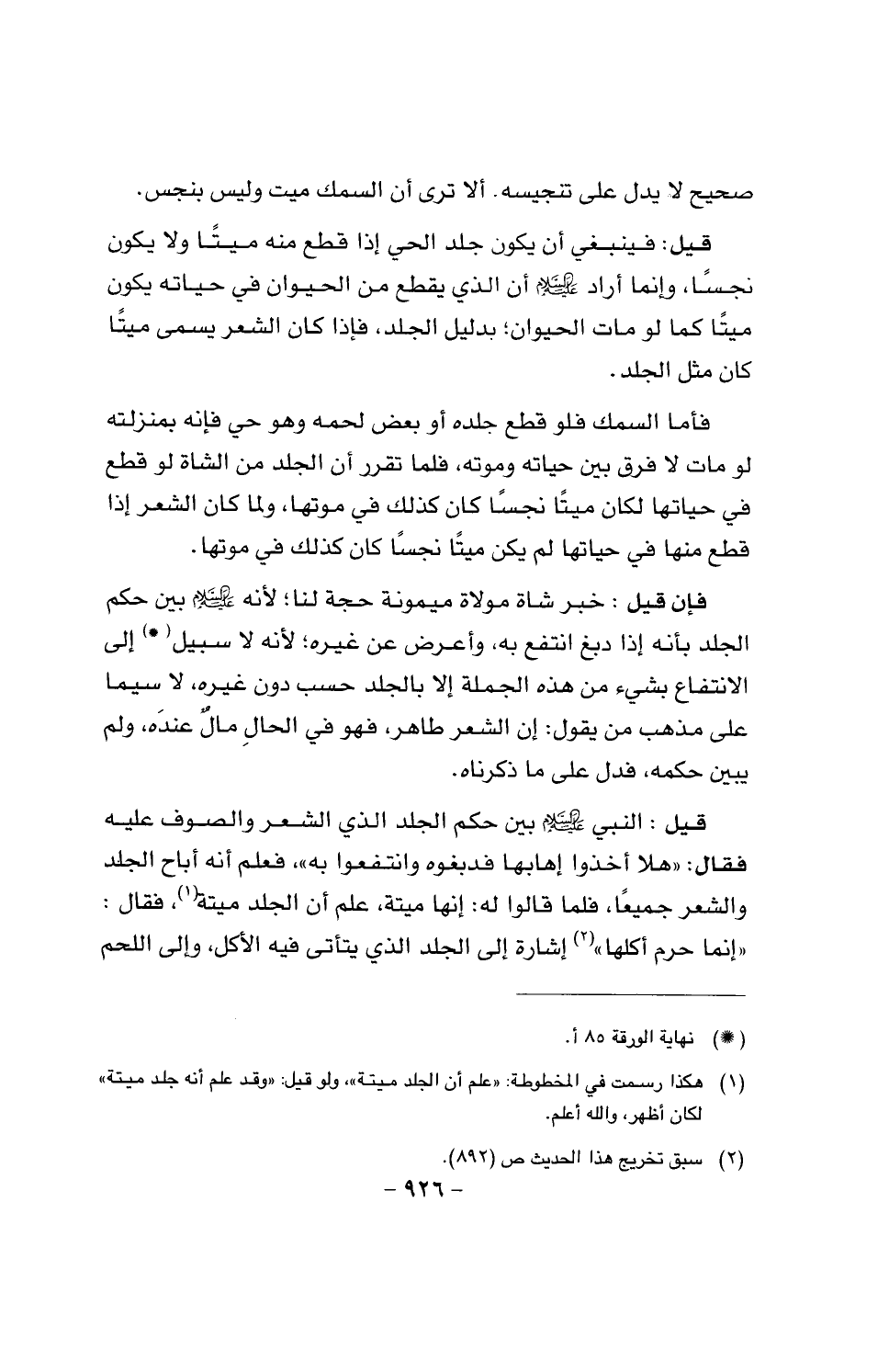 قيل: فينبغي أن يكون جلد الحي إذا قطع منه ميتا ولا يكون نجسا، وإنما أراد عليه السلام أن الذي يقطع من الحيوان في حياته يكنن ميتا كما لو مات الحيوان؛ بدليل الجلد، فإذا كان الشعر يسمى ميتا كان مثل الجلد.