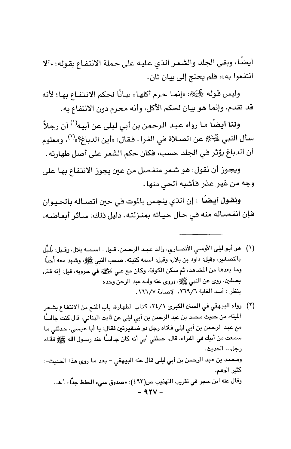 ولنا أيضا ما رواه عبد الرحمن بن أبي ليلى عن أبيه أن رجلا سأل النبي عليه السلام عن الصلاة في الفرا. فقال: (أين الدباغ؟)، ومعلوم أن الدباغ يؤثر في الجلد حسب، فكان حكم على أصل طهارته