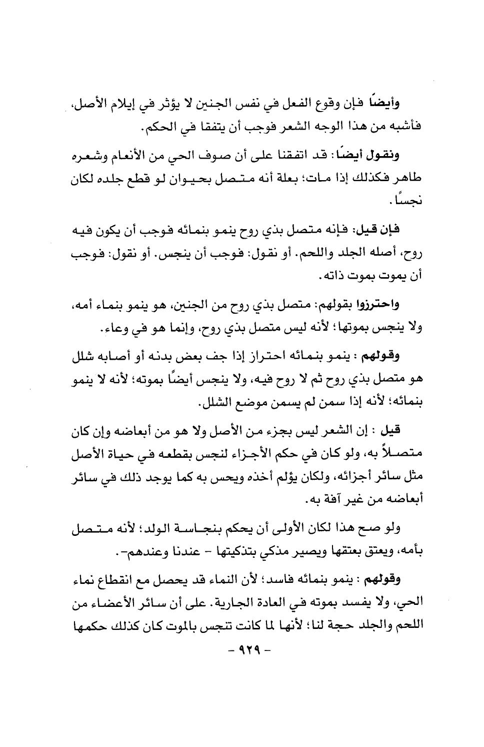 ونقول أيضا: قد اتفقنا على أن صوف الحي من الأنعام وشعره طاهر فكذلك إذا مات؛ بعلة أنه متصل بحيوان لو قطع جلده لكان نجسا.
